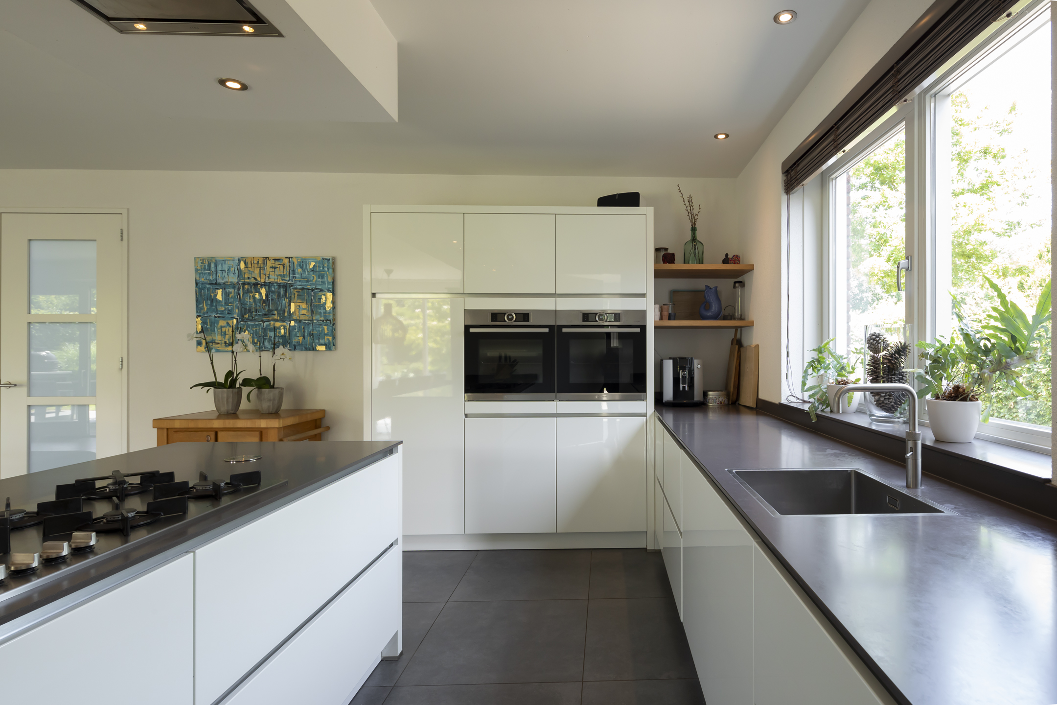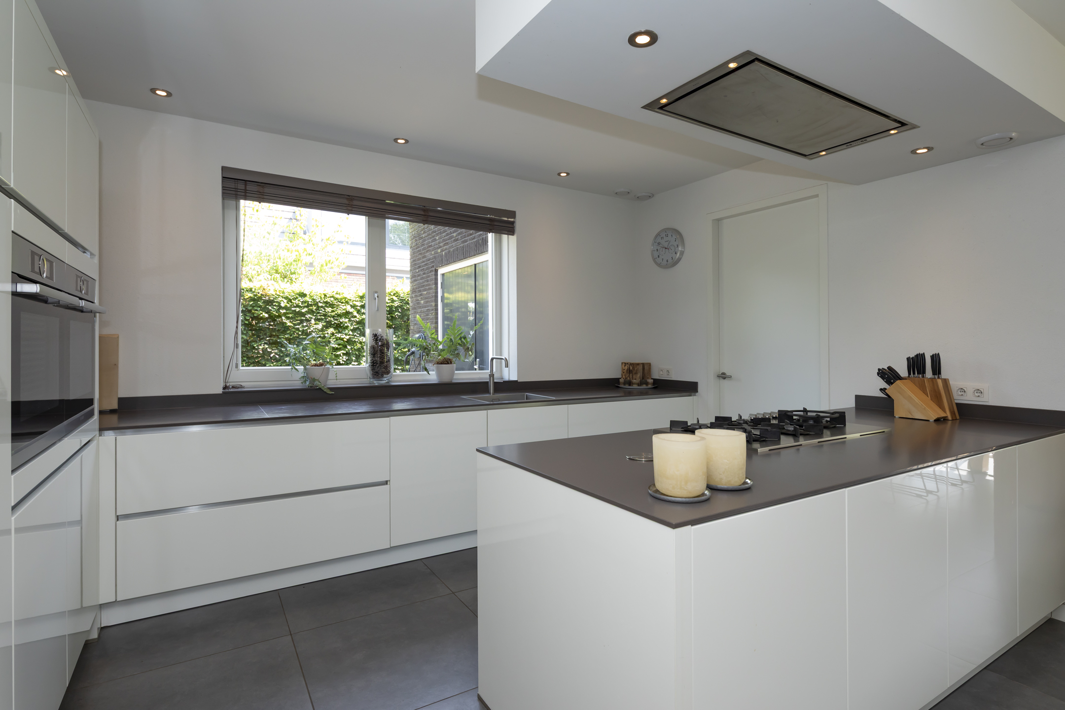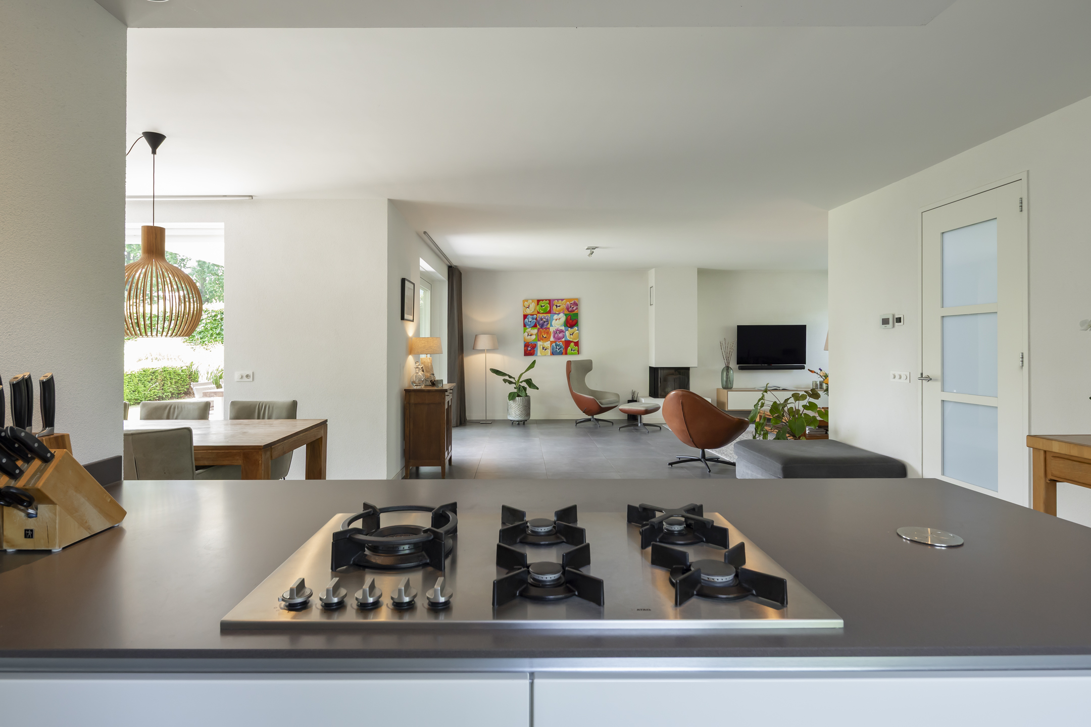 Kookliefhebbers halen hier hun hart op! Deze luxueuze keuken is voorzien van een fijne Quooker, een stoombakoven en een hetelucht oven, een koelkast en een vaatwasser. Het schierkookeiland heeft een 4-pits gaskookplaat en een wokbrander, de afzuigkap is geïntegreerd in het plafond. De keuken heeft een fraai composiet aanrechtblad en heeft zowel veel werk- als veel bergruimte dankzij de brede lades en keukenkasten. Hij is greeploos en wit hoogglans, hetgeen mooi contrasteert met de vloer. Terwijl u kookt bent u tóch gezellig betrokken bij het gezelschap aan tafel en hoeft u niets te missen.