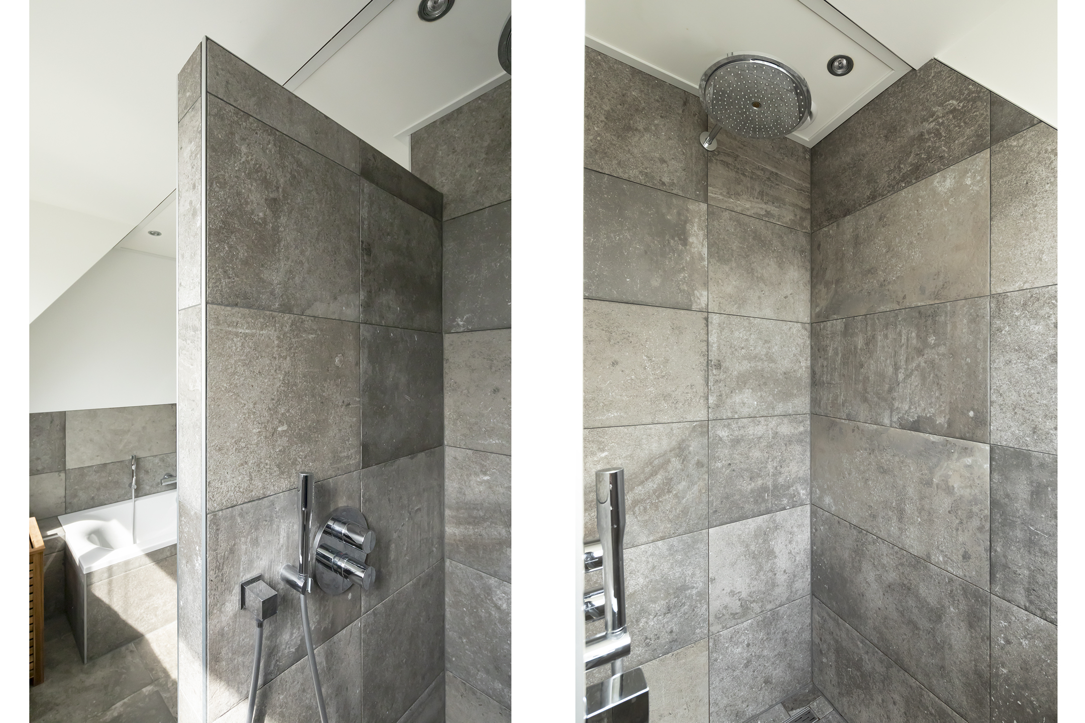 De badkamer is van alle gemakken voorzien, heeft een groot ligbad, een ruime inloopdouche en een dubbele wastafel geïntegreerd in een badkamermeubel. De badkamer beschikt over fijn natuurlijk daglicht, dankzij het grote raamkozijn. Hij is netjes betegeld en is voorzien van aangename vloerverwarming en een designradiator