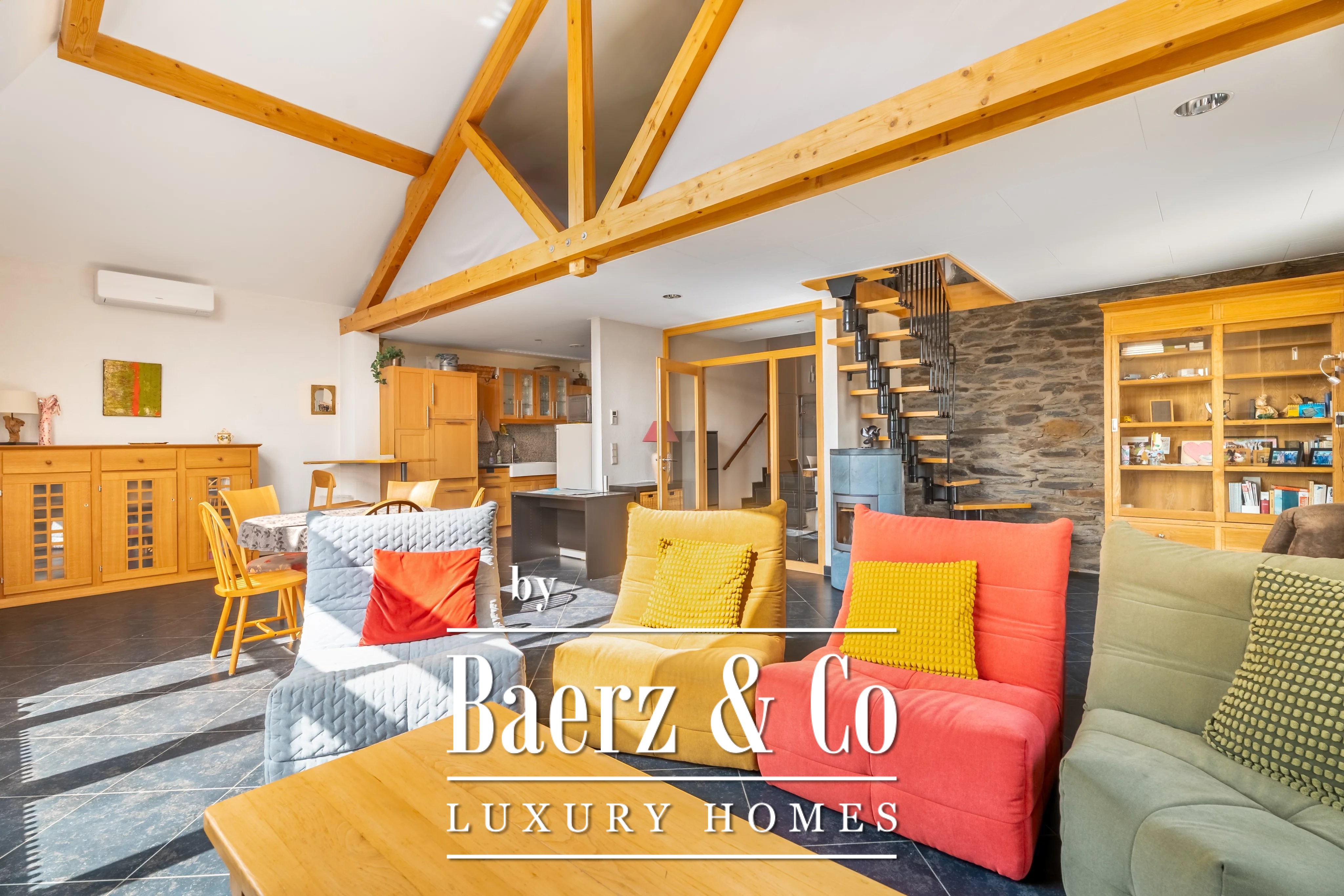 Op de eerste verdieping een woonkamer van 48,77 m² met houthaard en airconditioning (warm en koud); een uitgerust keuken van 11,65 m²; een mezzanine van 12,59 m² (waarvan 34,85 m² op de vloer); een hal van 6,47 m²; een apart toilet van 1,24 m²; een badkamer van 7,73 m² met bad, douche en dubbele wastafel. Terras van 14 m² gericht op het zuidoosten.