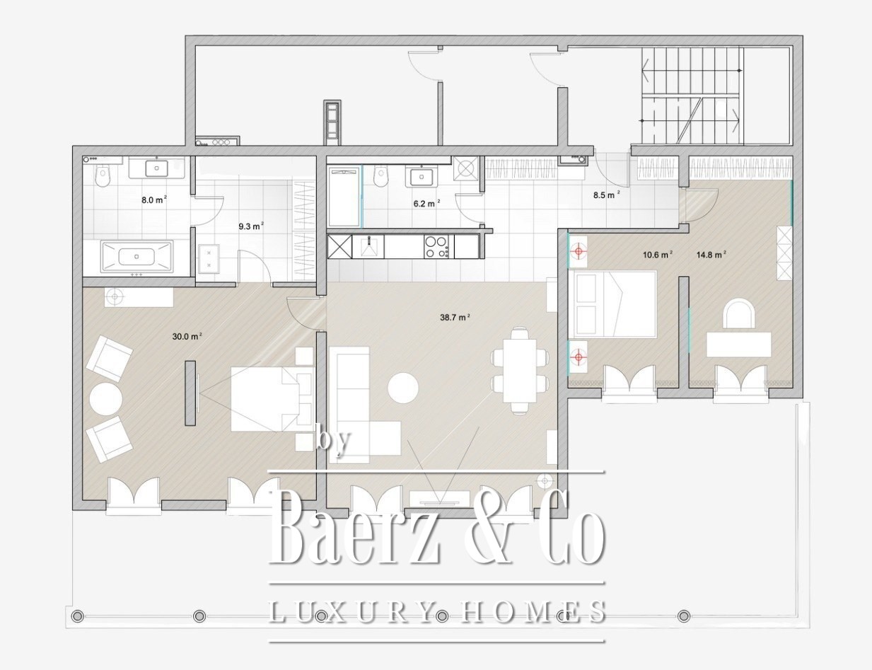 Appartement Herceg Novi is rustig gelegen op de tweede verdieping van een exclusief complex dat bestaat uit vijf elegante gebouwen, direct boven de kustlijn van Montenegro. Deze residence, met een totaaloppervlakte van 179 m² inclusief een panoramisch terras van 54 m², vormt een vloeiende verbinding tussen het binnencomfort en het mediterrane licht. De plattegrond straalt een ruimtelijk ritme uit: een uitnodigende hal, drie slaapkamers, een open woonkamer met keuken en eetgedeelte, en twee badkamers; alles gericht op het maximaliseren van de helderheid van de natuurlijke omgeving.