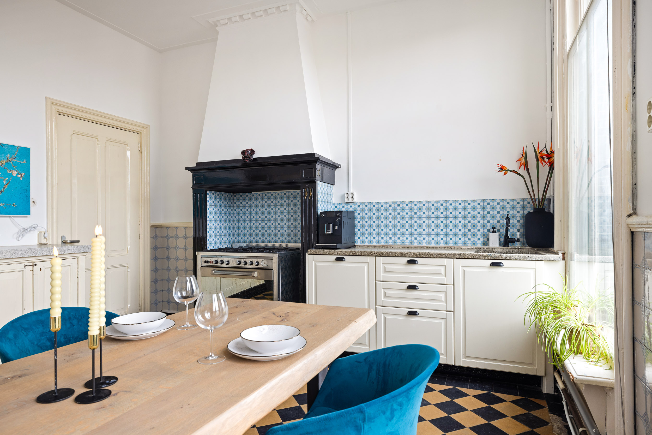 Via de rechter voordeur betreedt men het woongedeelte, waar het originele troggewelf en de karakteristieke vloertegels direct de authentieke sfeer oproepen. De sfeervolle tuinkamer aan de achterzijde heeft rijk gedecoreerde openslaande deuren naar het terras en de diepe, zonnige patio-tuin met dubbel achterom. De ruime kelder vormt een ideale plek voor een fraaie wijnvoorraad.