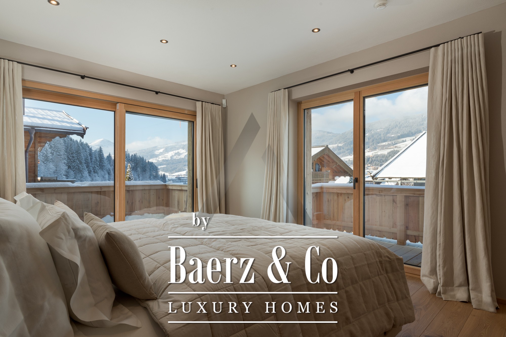 Op de eerste verdieping vindt u twee stijlvolle slaapkamers, beide met en-suite badkamers en toegang tot balkons met uitzicht op de imposante bergen. De bovenste verdieping bestaat uit een open living, eetkamer en keuken—een ideale ruimte voor ontspanning en gastenontvangst. Hier bepalen authentieke zichtbare houten balken, een moderne keuken, een open haard en panoramisch bergzicht het karakter, terwijl de royale balkonterrassen het natuurlijke licht van ochtend tot avond binnenlaten.