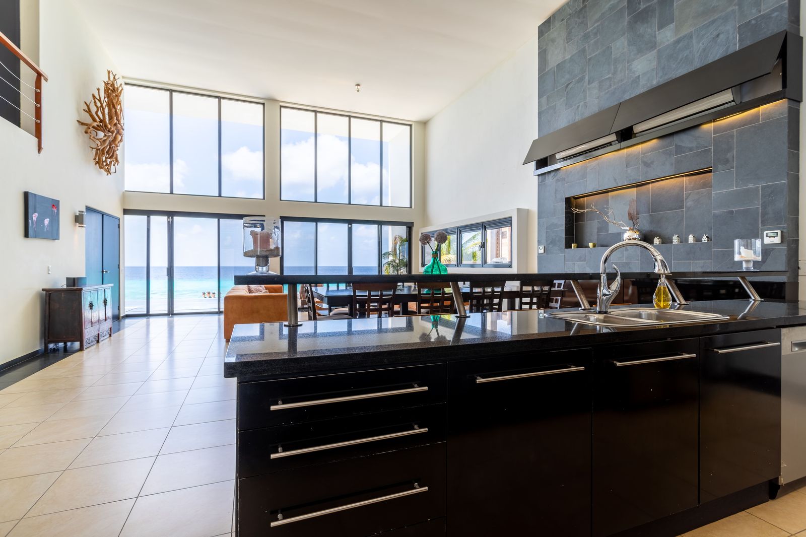 De grote schuifdeuren leiden direct naar het terras met een privézwembad en jacuzzi, waar je geniet van een panoramisch uitzicht over de Caribische Zee. De buitenruimte biedt meerdere zit- en loungeplekken: ideaal om gasten te ontvangen of simpelweg te ontspannen tijdens onvergetelijke zonsondergangen. Via de trap bereik je direct vanuit het terras het strand en de oceaan, waar je de kristalheldere wateren letterlijk aan je voeten hebt.