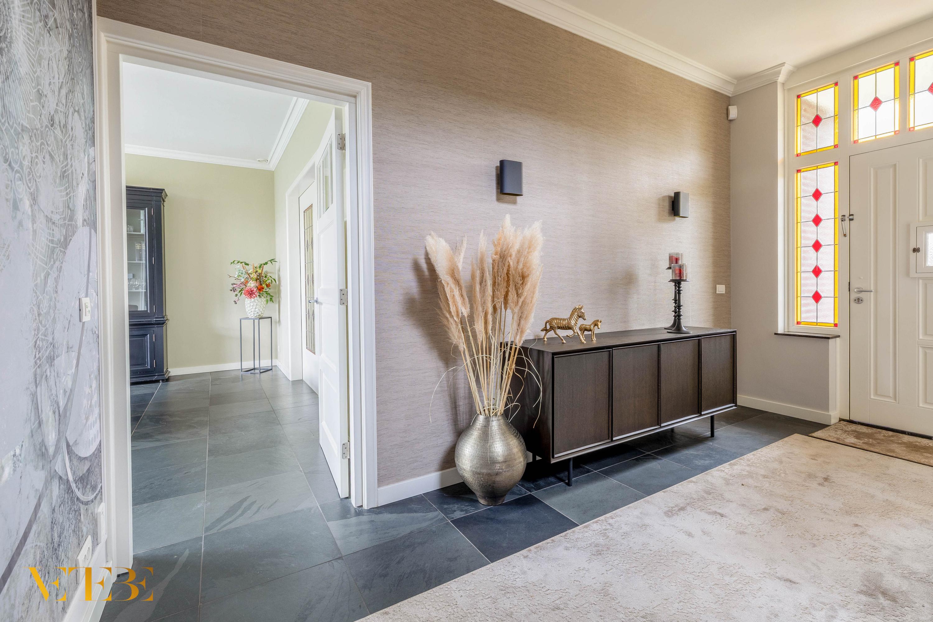 De begane grond (m.u.v. de garage) is voorzien van vloerverwarming. In de royale entree zijn het toilet met fonteintje en een trapkast aanwezig. Hier bevindt zich ook het kantoor (ca. 10,5m²) met tegelvloer, airco en een vaste kastenwand met schuifdeuren.