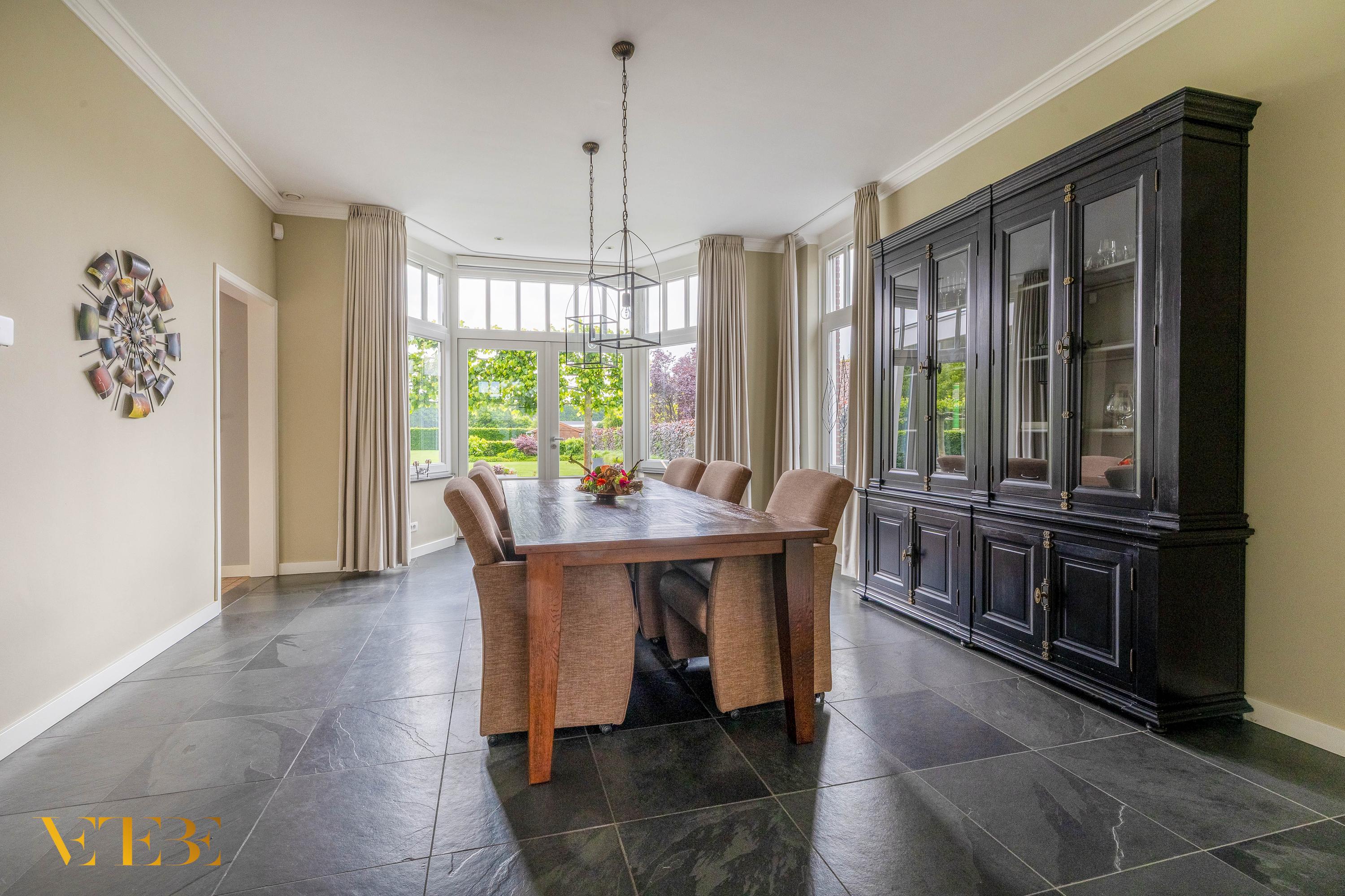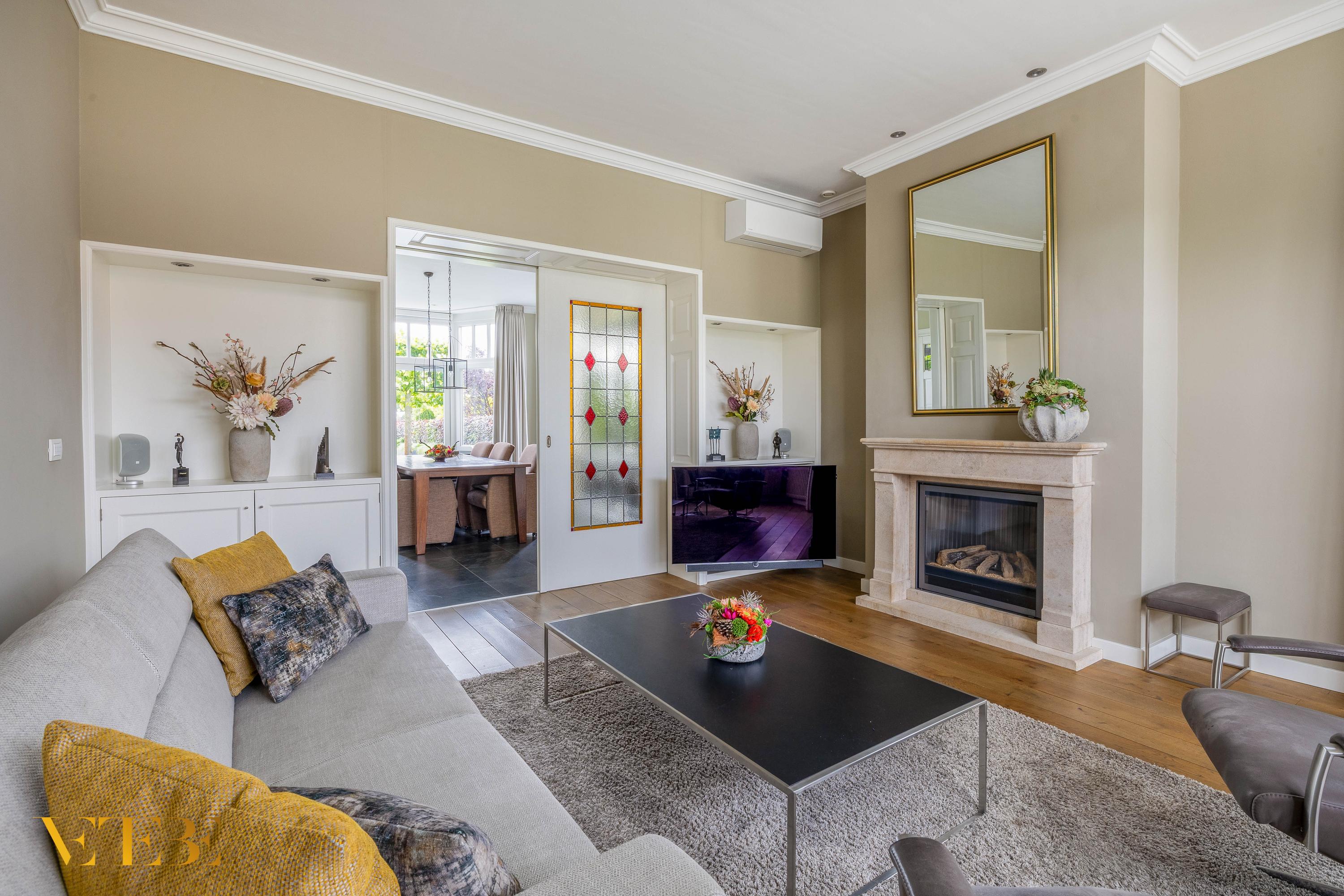 In de, met licht overgoten, woonkamer ligt in het voorste gedeelte een houten vloer. Vanuit de erker is er zicht op de eigen voortuin. Hier zijn een mooie gashaard. airco en twee muurkasten aanwezig. De prachtige en-suite deuren met glas-in-lood bieden toegang tot de eetkamer. Hier ligt een tegelvloer en is ook een muurkast aanwezig. Openslaande deuren bieden toegang tot de tuin. De woonkamer is ca. 53m².