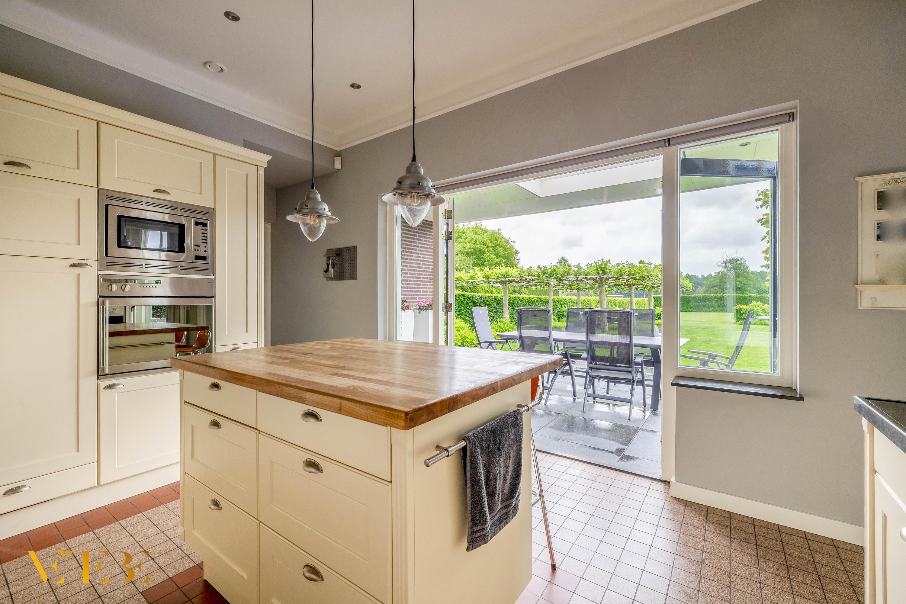 De grote keuken (ca. 16m²) is uitgerust met een keramische kookplaat, afzuigkap, koelkast, vaatwasser, oven en magnetron. Ook hier bieden openslaande deuren toegang tot de tuin.