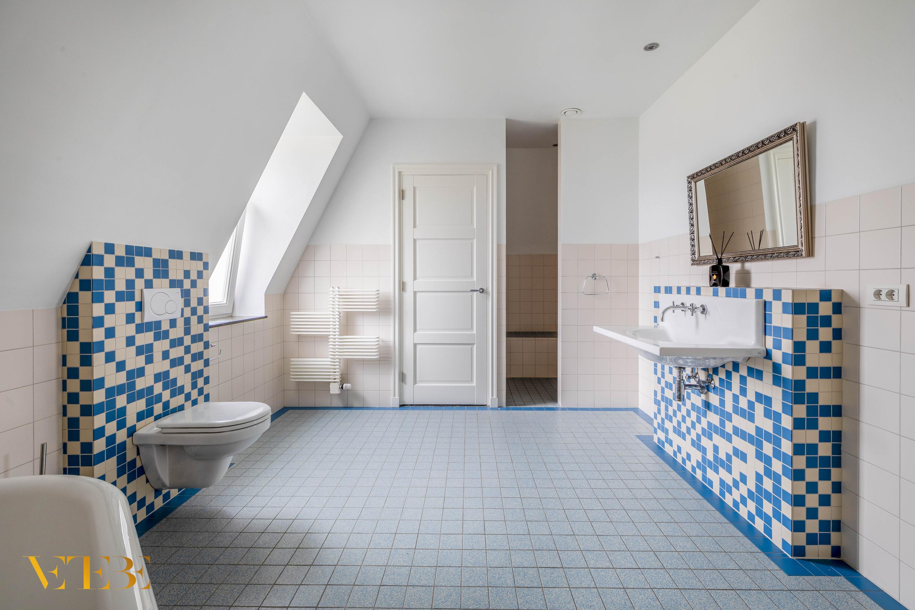 In de badkamer (ca. 15m²) ligt een tegelvloer met vloerverwarming. Er zijn een ligbad, inloopdouche, wastafel, toilet en designradiator aanwezig. Het is een grote badkamer met een dakkapel die zorgt voor veel daglicht.