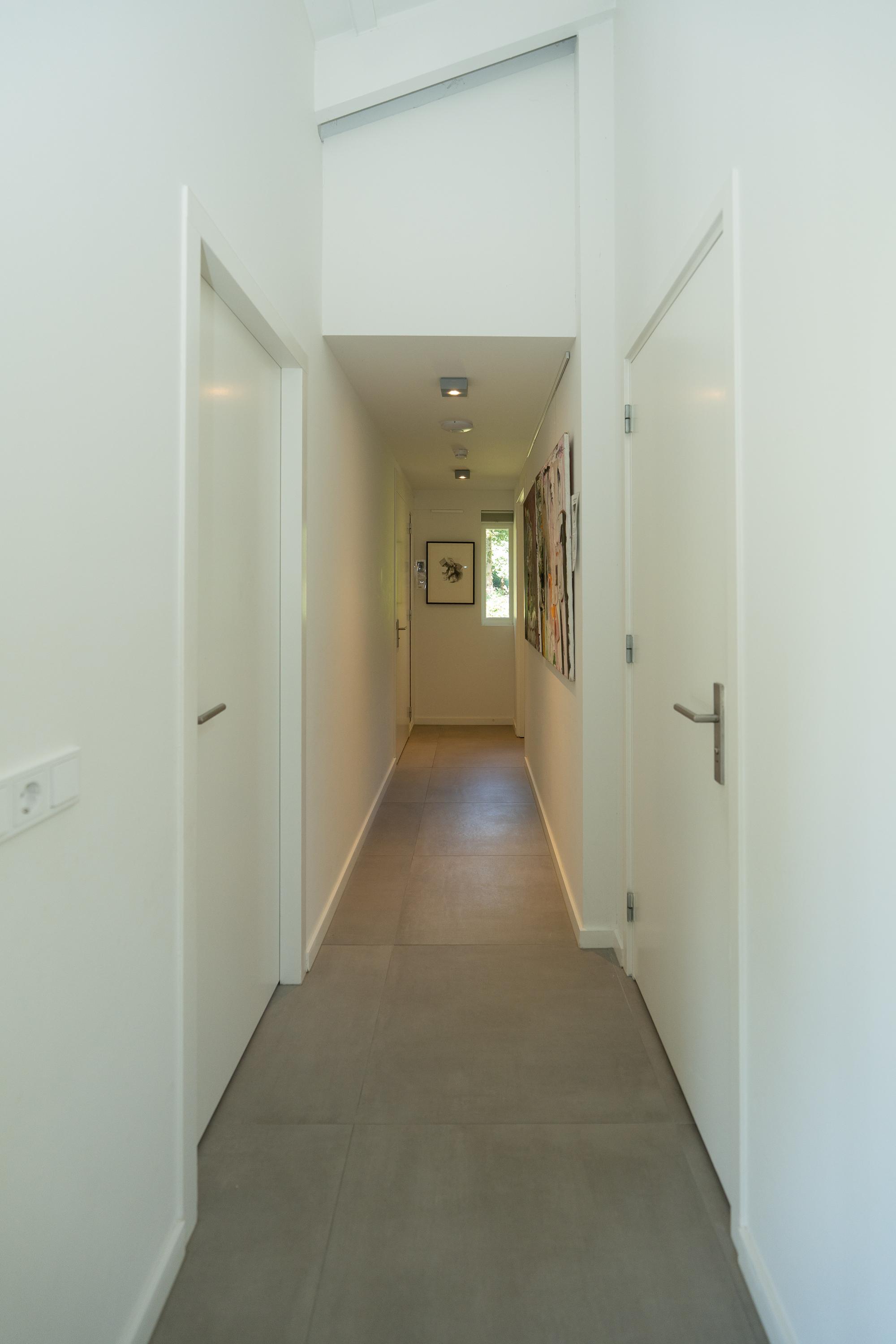 Entree, royale hal die gelijk het ruimtelijke karakter van de woning benadrukt. In de hal bevinden zich de meterkast, vliering en het eerste toilet met fonteintje. Een ruime woonkamer met hoge nok, waar de vele ramen aan alle zijden zorgen voor een prachtige lichtinval en een open sfeer. Zowel aan de voor- als achterzijde zijn er schuifpuien naar de voor- en achtertuin. Verder is er nog een ruime inpandige berging onder de trap en de trapopgang zelf is fraai weggewerkt. Moderne open keuken met een groot kookeiland. De hoge kasten zijn fraai weggewerkt in de muur en de keuken is voorzien van diverse luxe inbouwapparatuur. De bijkeuken is gesitueerd aan de voorzijde van de woning en heeft een keukenblok, opstelling van de warmtepomp en boiler en een extra buitendeur.