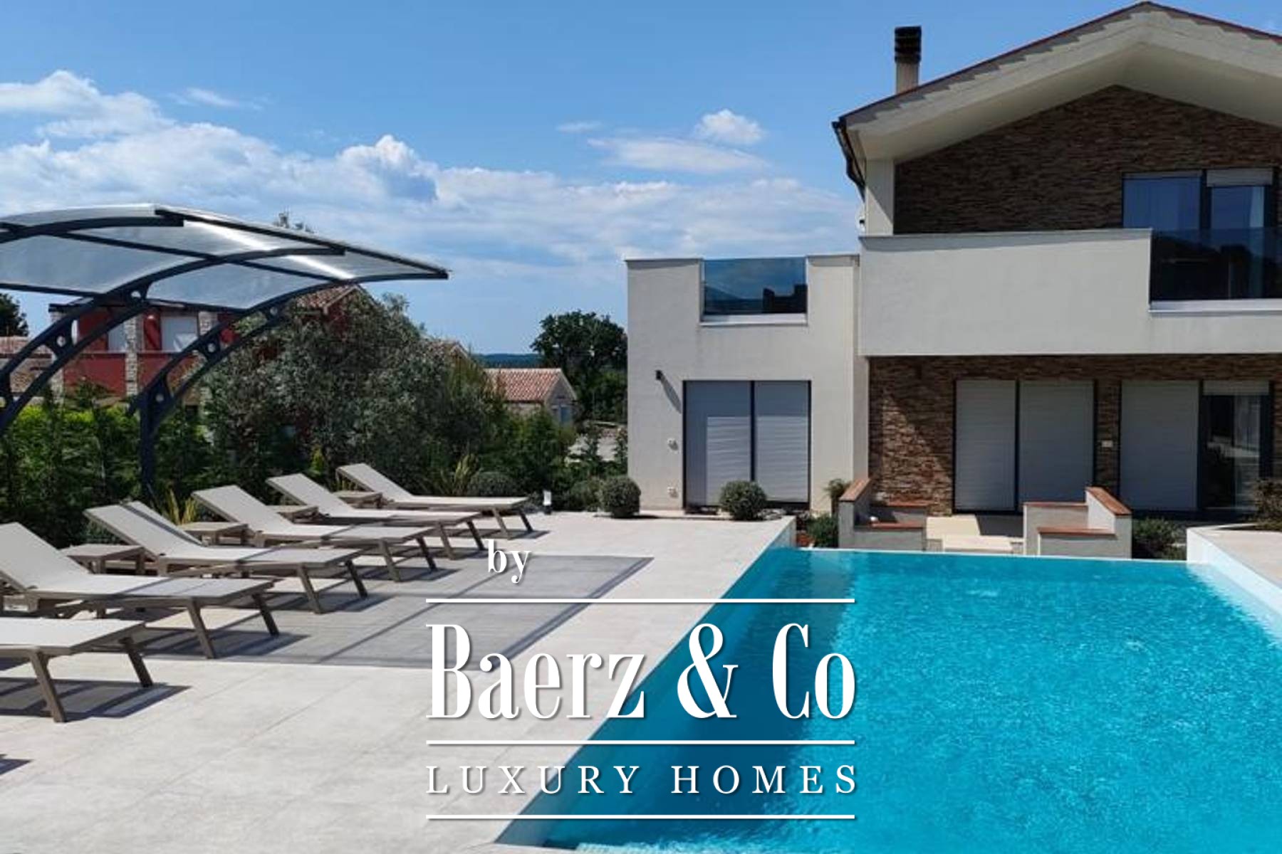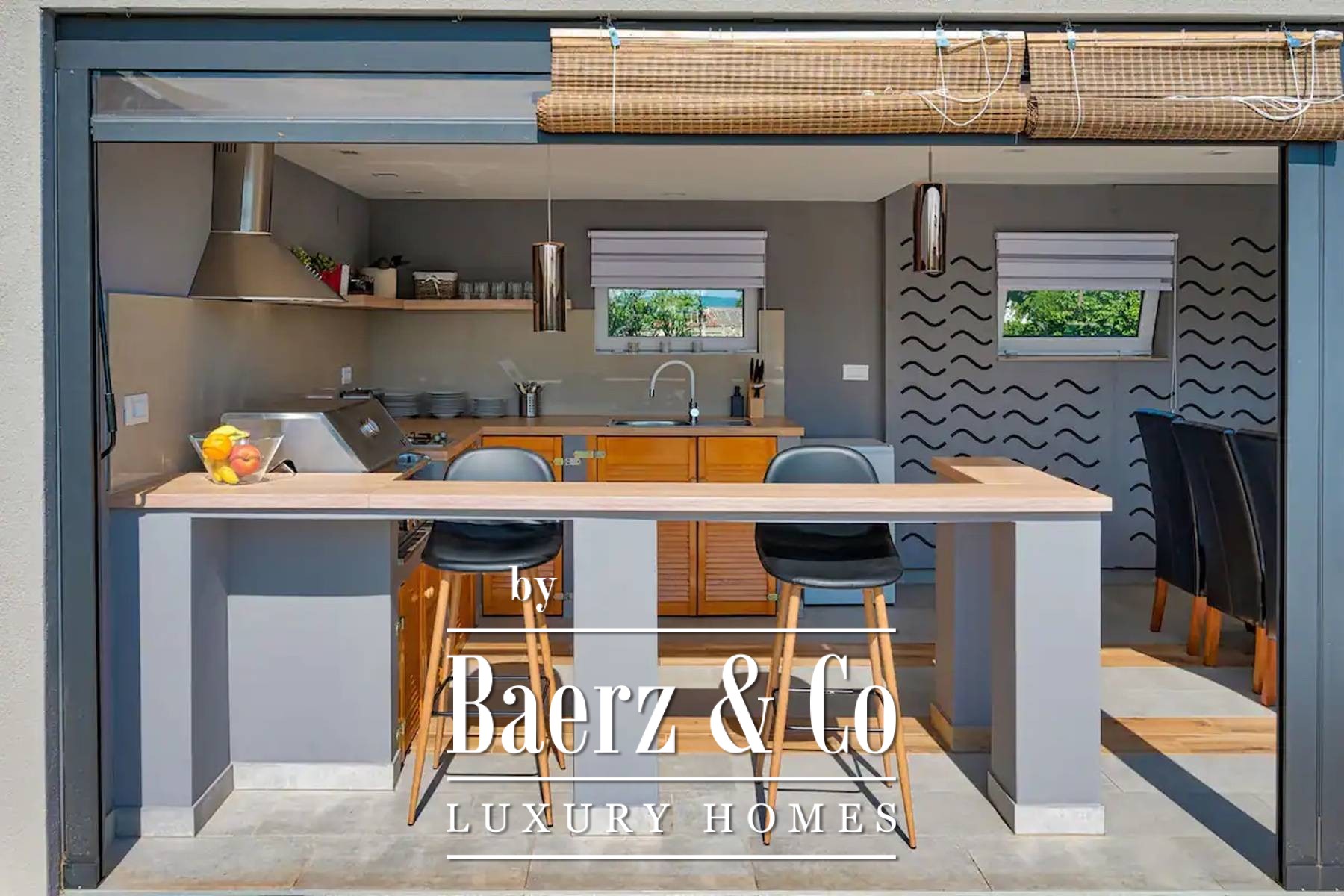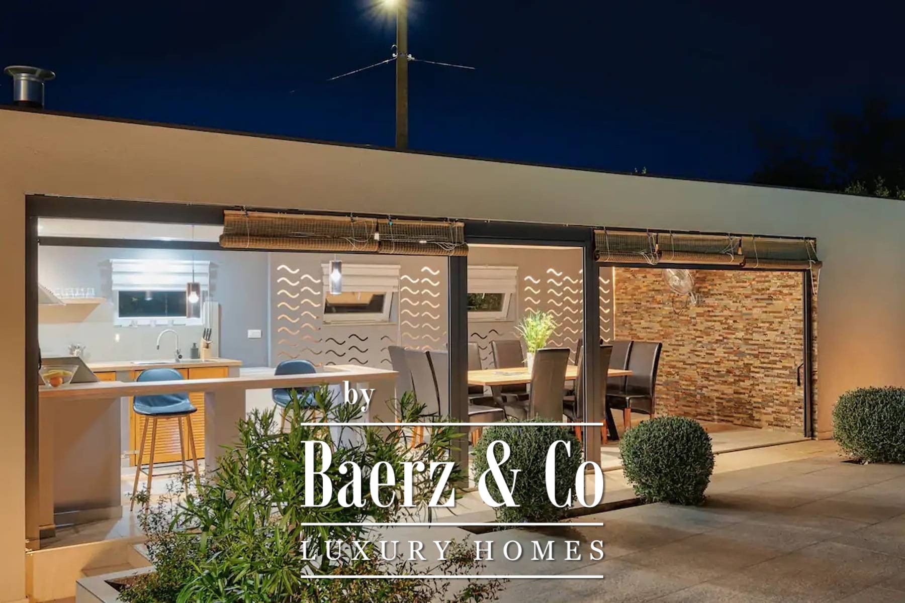 Villa Rakalj in Marčana, Kroatië, biedt een weloverwogen balans tussen moderniteit en rust. Deze villa beschikt over een woonoppervlakte van 315 m² in een serene omgeving, omgeven door een royaal perceel van 1.150 m². De architectuur staat in het teken van openheid, met veel natuurlijk licht in alle zes de slaapkamers en badkamers, en een beheerste, verfijnde sfeer door het hele huis. Twee zorgvuldig ingerichte keukens versterken het dagelijkse comfort en faciliteren zowel intieme bijeenkomsten als feestelijke momenten.