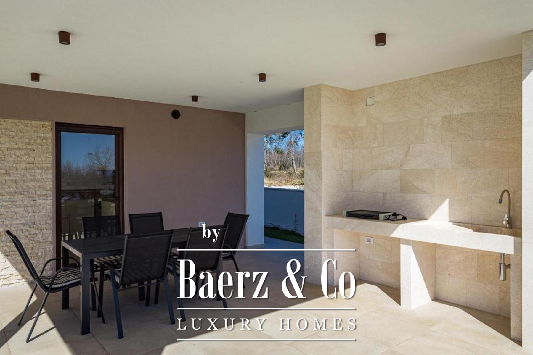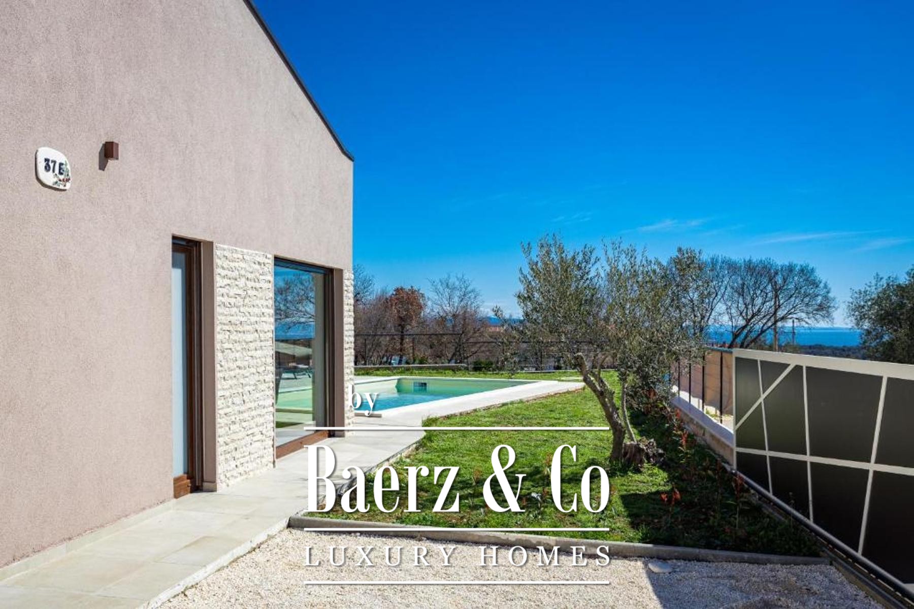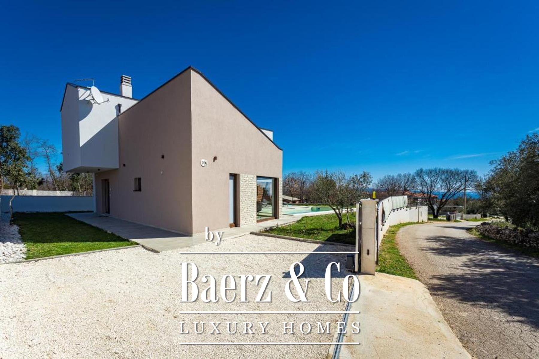 Buiten zorgt de aangelegde tuin van 500 m² voor privacy en rust, met als middelpunt een zwembad dat is voorbereid op de installatie van een verwarmingssysteem. Een overdekte zomerkeuken, decoratieve beplanting en een olijfboom herinneren aan de mediterrane ambiance, omlijst door omheining, een stenen muur en een schuifpoort. Deze moderne villa Marčana combineert sereniteit, design en de nabijheid van de Adriatische kust.