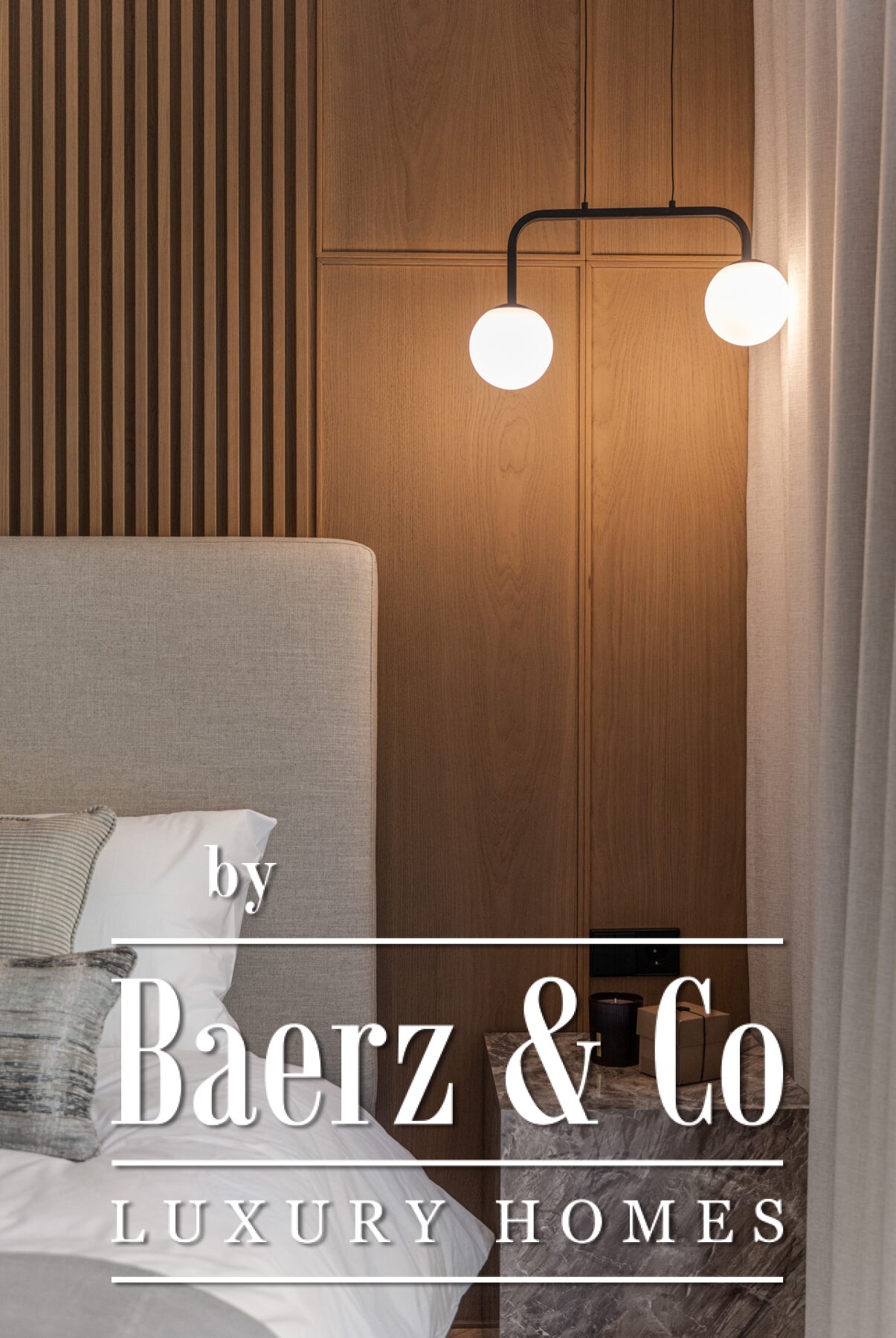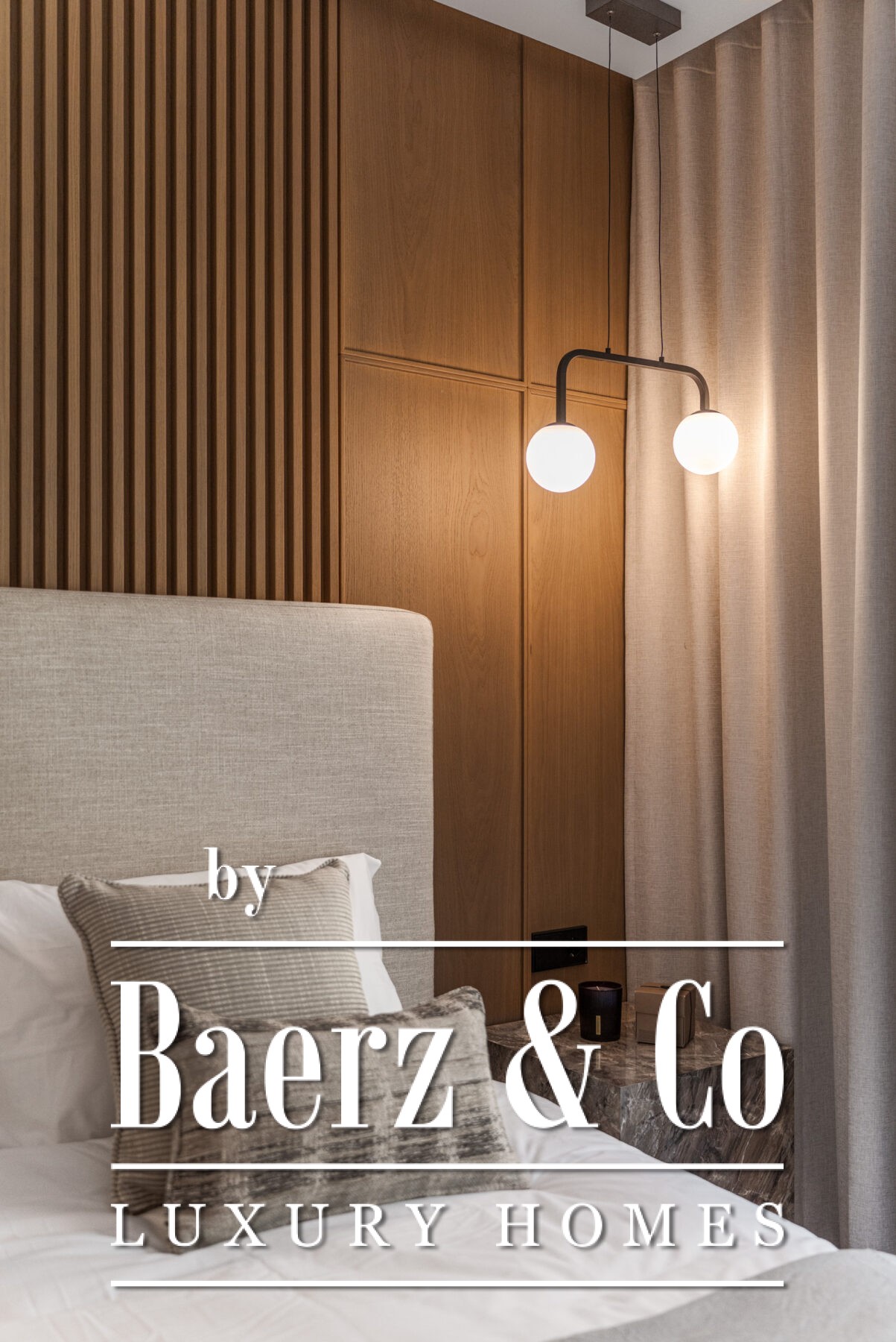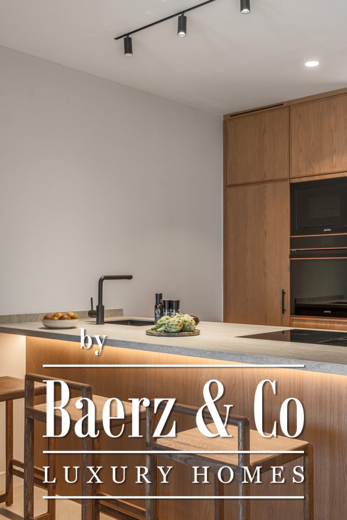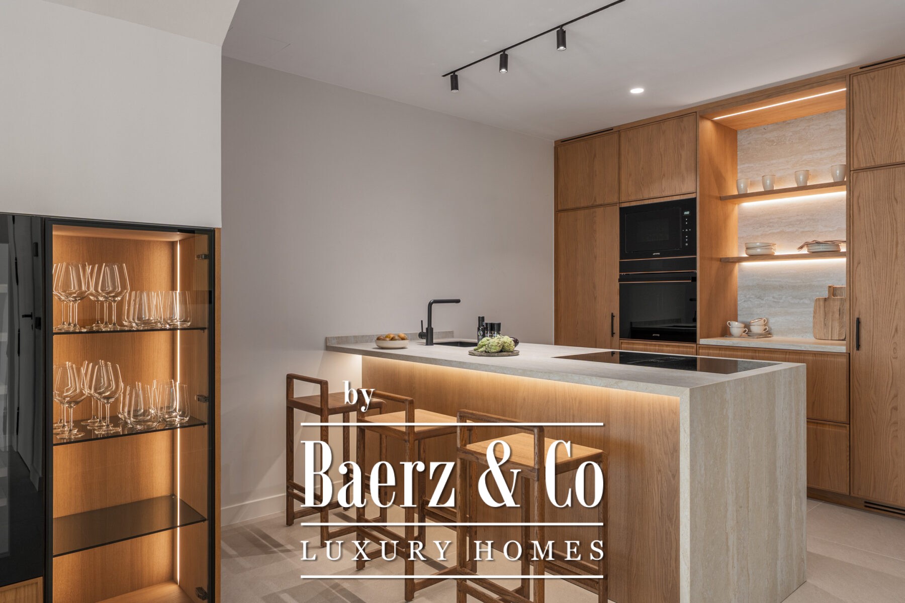 On the ground floor, the home opens up to a bright and spacious open-plan kitchen, dining, and living area. Custom-designed by a Danish studio, the kitchen is equipped with Smeg appliances and includes a stylish peninsula with a wine fridge and display cabinet. The living area is centered around a bioethanol fireplace from Pureline, adding a cozy element to the clean interior aesthetic. Large sliding glass doors connect the indoor space with a private garden terrace that includes a built-in barbecue, ideal for outdoor entertaining.