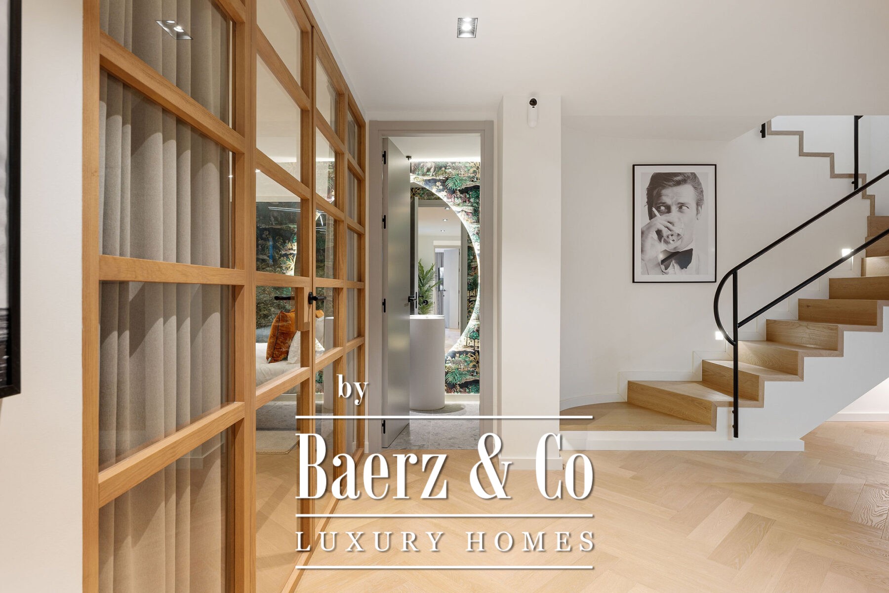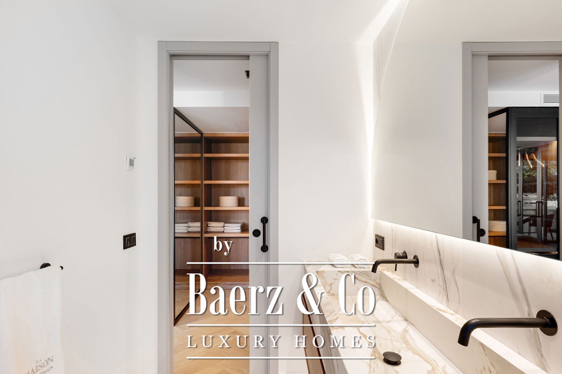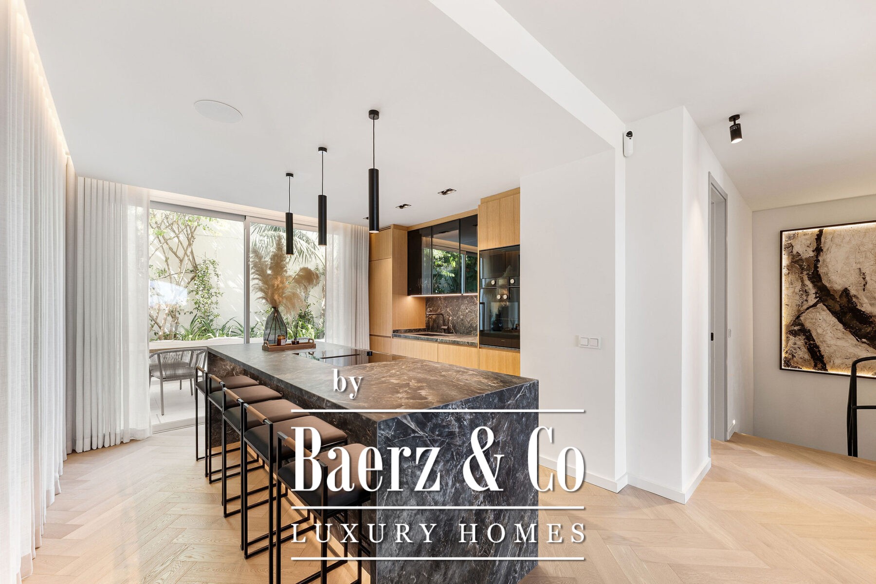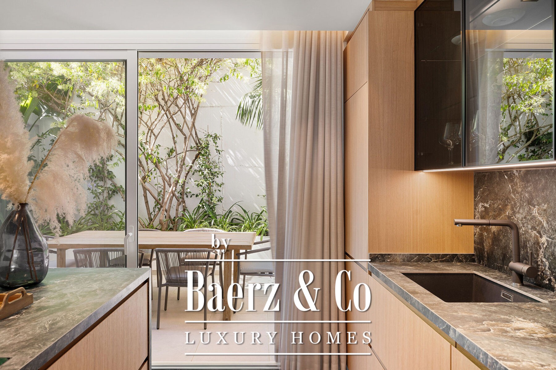 The interior design is distinguished by premium wood and marble finishes, highlighting meticulous craftsmanship in every detail. The ground floor showcases an open-plan layout where the living, dining, and kitchen areas merge harmoniously, creating an inviting space filled with natural light. The kitchen, fitted with state-of-the-art Gaggenau appliances, is as stylish as it is practical, offering a seamless cooking experience. Extending from this area is a private patio, ideal for alfresco dining and relaxation. The sophisticated living area is accentuated by refined herringbone wooden floors and a neutral color palette, enhancing the overall sense of warmth and sophistication.