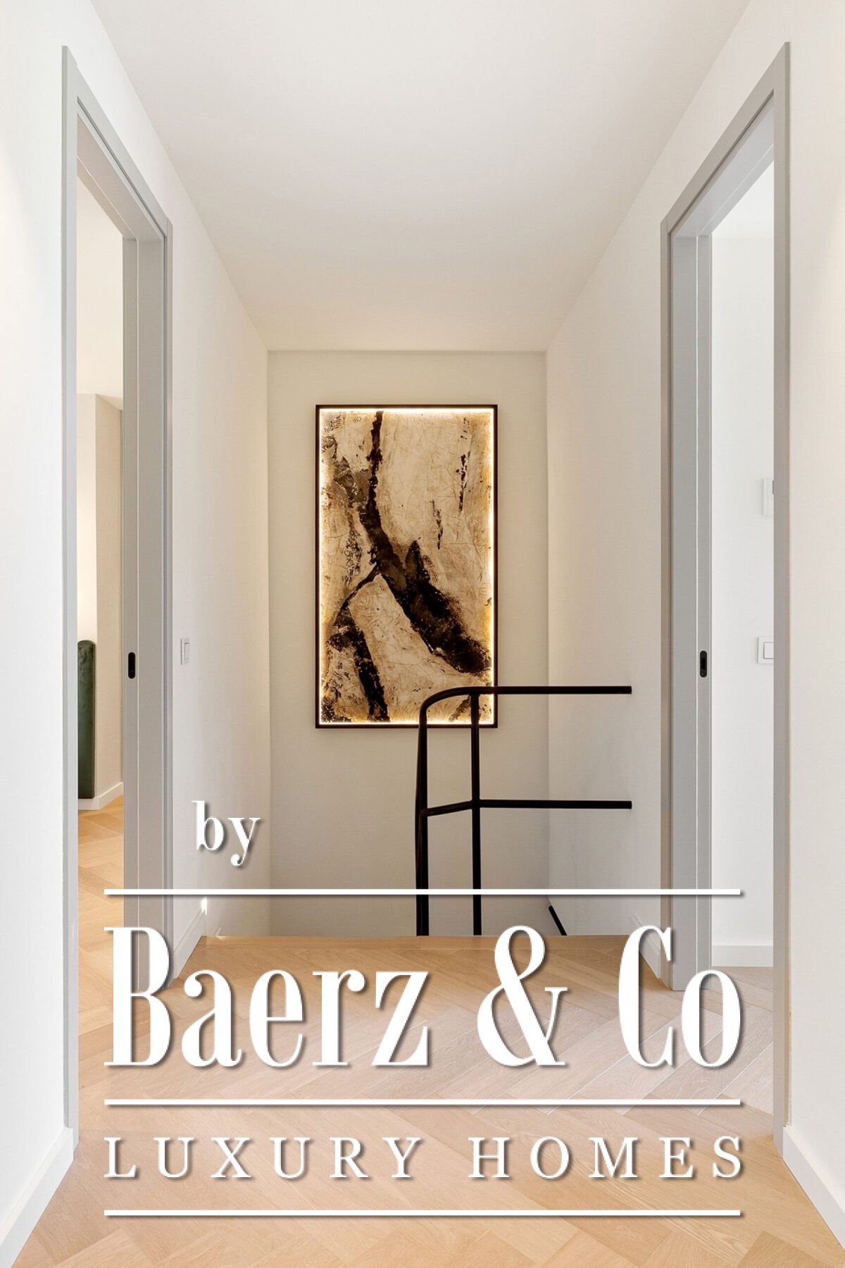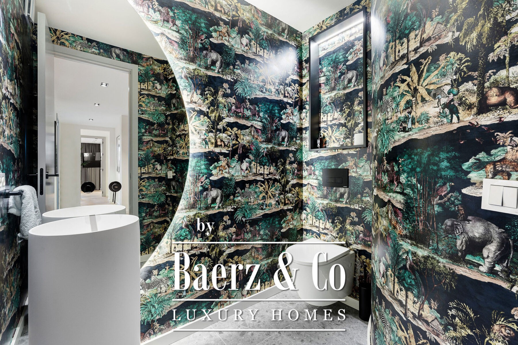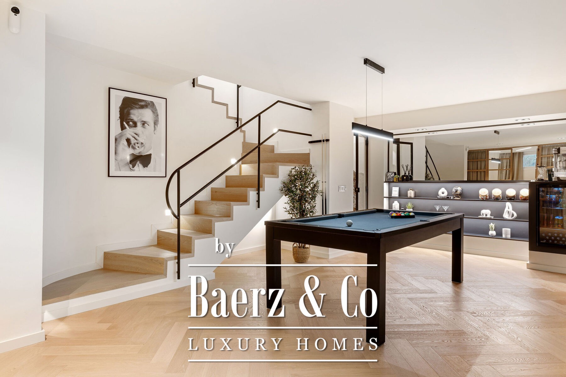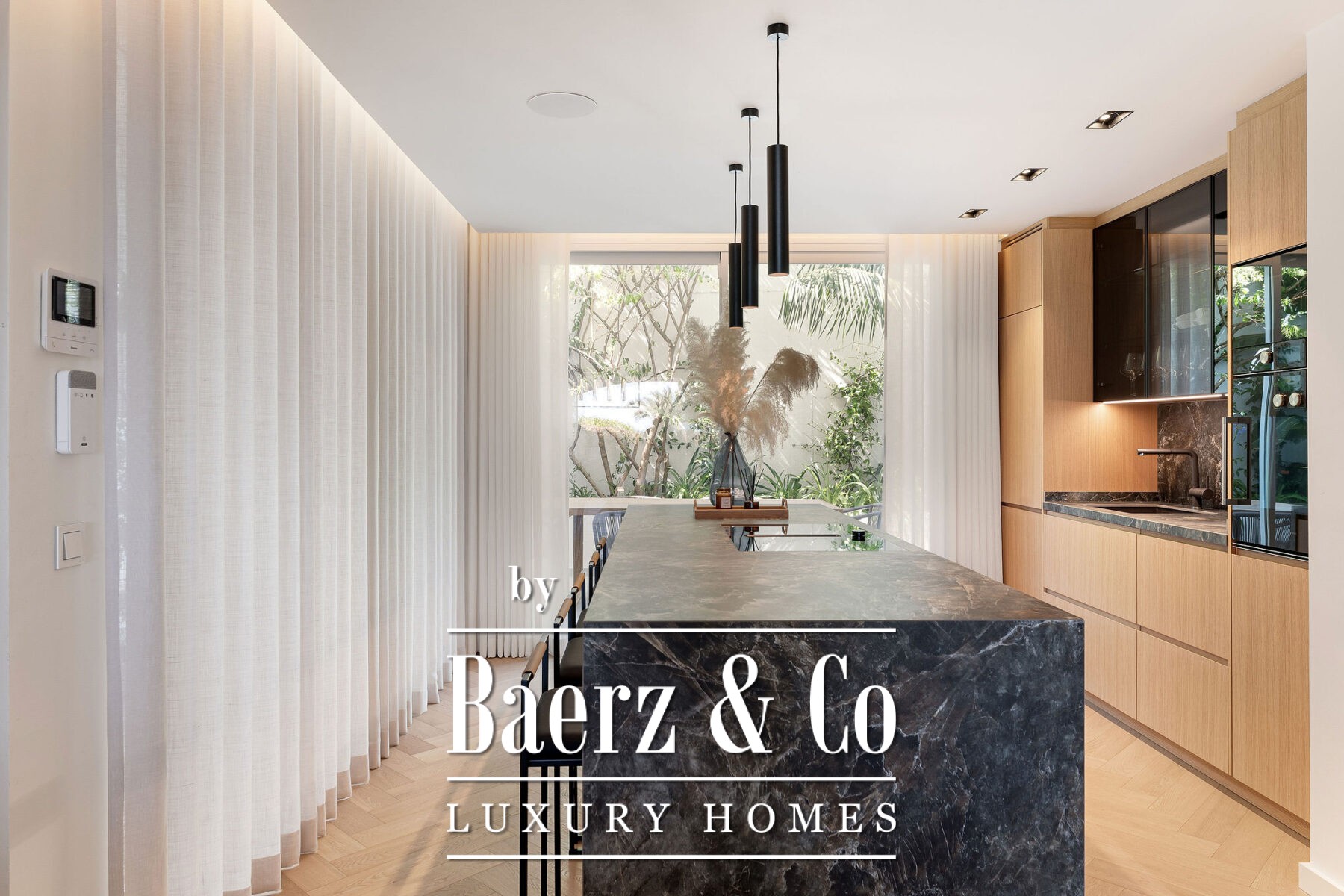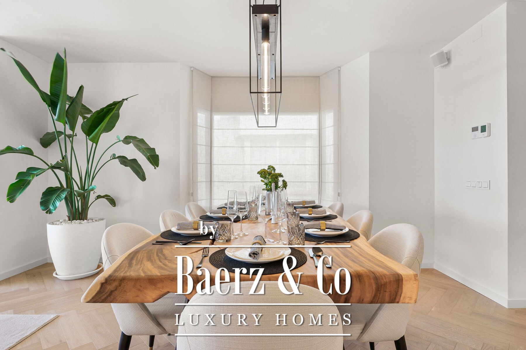 The interior design is distinguished by premium wood and marble finishes, highlighting meticulous craftsmanship in every detail. The ground floor showcases an open-plan layout where the living, dining, and kitchen areas merge harmoniously, creating an inviting space filled with natural light. The kitchen, fitted with state-of-the-art Gaggenau appliances, is as stylish as it is practical, offering a seamless cooking experience. Extending from this area is a private patio, ideal for alfresco dining and relaxation. The sophisticated living area is accentuated by refined herringbone wooden floors and a neutral color palette, enhancing the overall sense of warmth and sophistication.