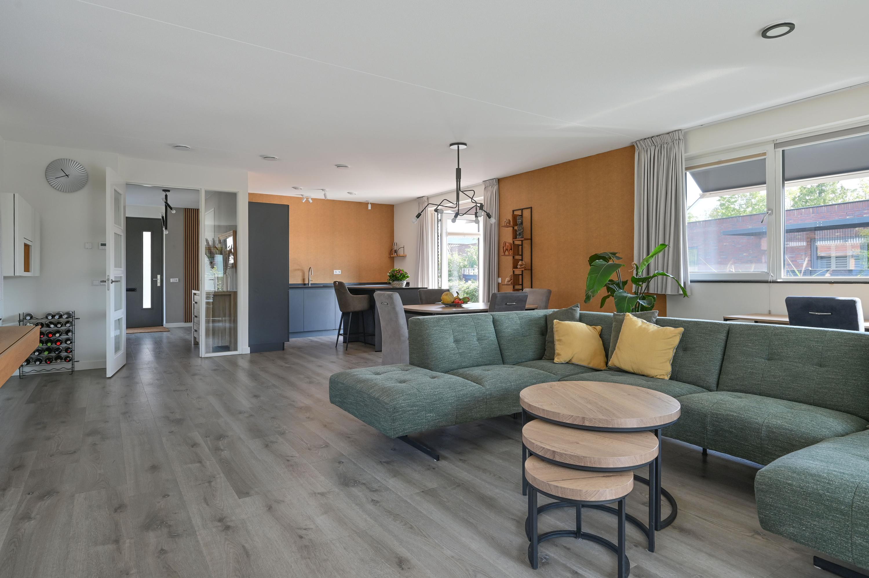 Aan het einde van de hal betreedt u via een paneeldeur met melkglas en extra zijraam de royale woonkamer met open keuken. Grote ramen rondom, voorzien van handmatig en elektrisch bedienbare zonneschermen, zorgen voor een prachtig lichtspel en een weids uitzicht. De moderne keuken in antracietgrijs heeft een stijlvol kunststof werkblad, een ruim eiland met lades en een gezellige zitbar. Hoogwaardige Siemens-inbouwapparatuur – waaronder vaatwasser, inductiekookplaat met geïntegreerde afzuiging, combi-stoomoven en koel-/vriescombinatie – maken koken hier een genot. De woonkamer is ruim opgezet en biedt de mogelijkheid om diverse zithoeken te creëren of af en toe de zithoek te veranderen van opzet. Via openslaande deuren in de keuken stapt u de achtertuin in, waar een elektrisch zonnescherm voor schaduw zorgt op zonnige dagen. De eetkamer sluit naadloos aan op de keuken, met daarachter de sfeervolle zithoek. Ook vanuit hier leiden openslaande deuren naar de zonnige zijtuin op het zuiden. De gehele begane grond is voorzien van een onderhoudsvriendelijke pvc-vloer in warme houtlook met comfortabele vloerverwarming. Alle ramen en buitendeuren zijn uitgerust met horren – een detail dat bijdraagt aan het wooncomfort.