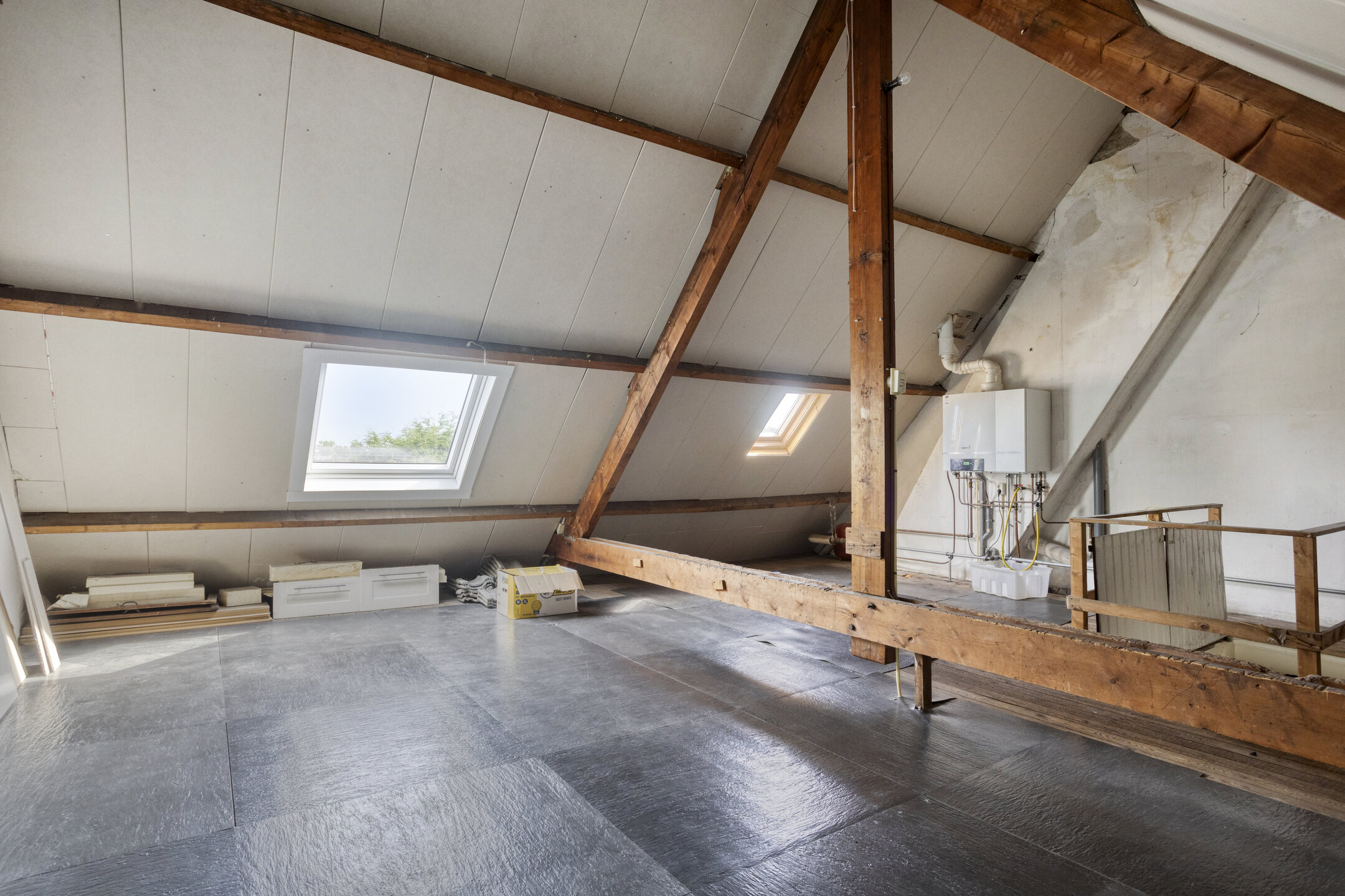 Via vaste trap bereikbaar: een riante zolder met indrukwekkende nokhoogte (ca. 4 m) en veel lichtinval door tuimelramen. Ook de opstelplaats van de HR cv-combiketel bevindt zich hier.