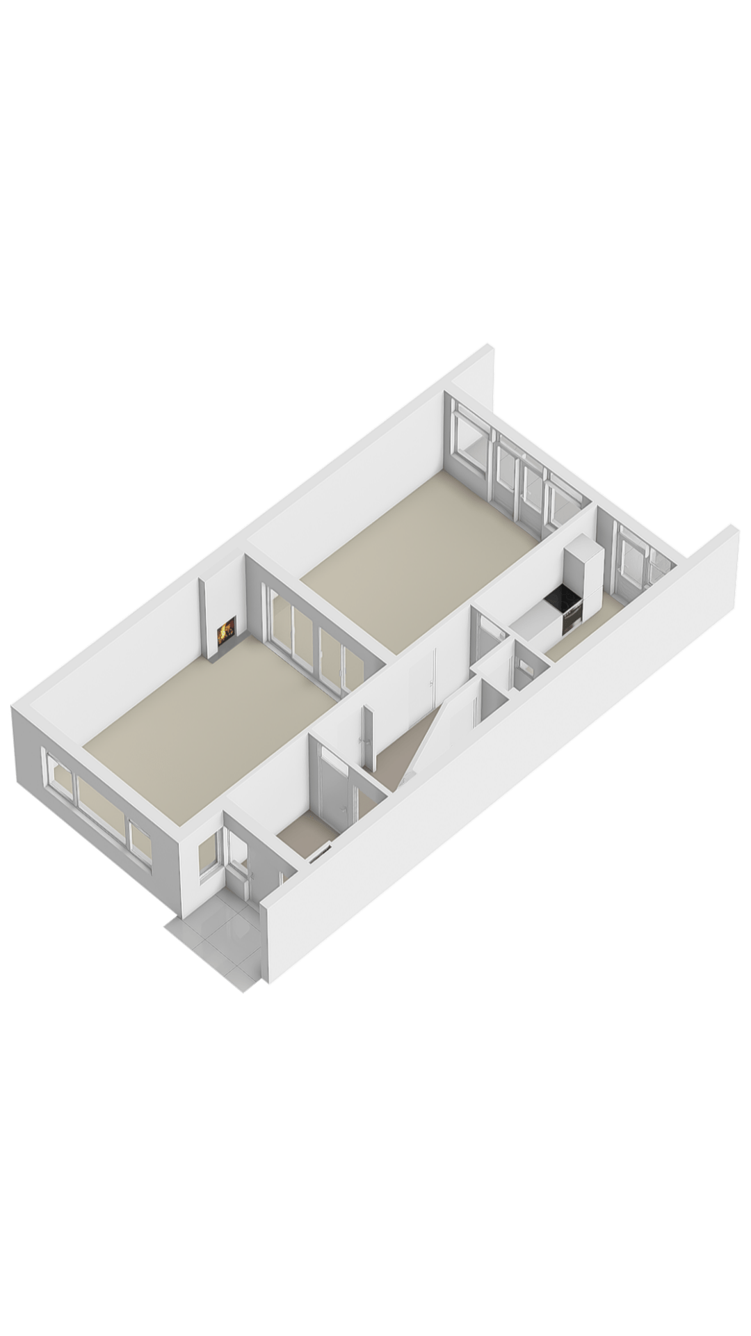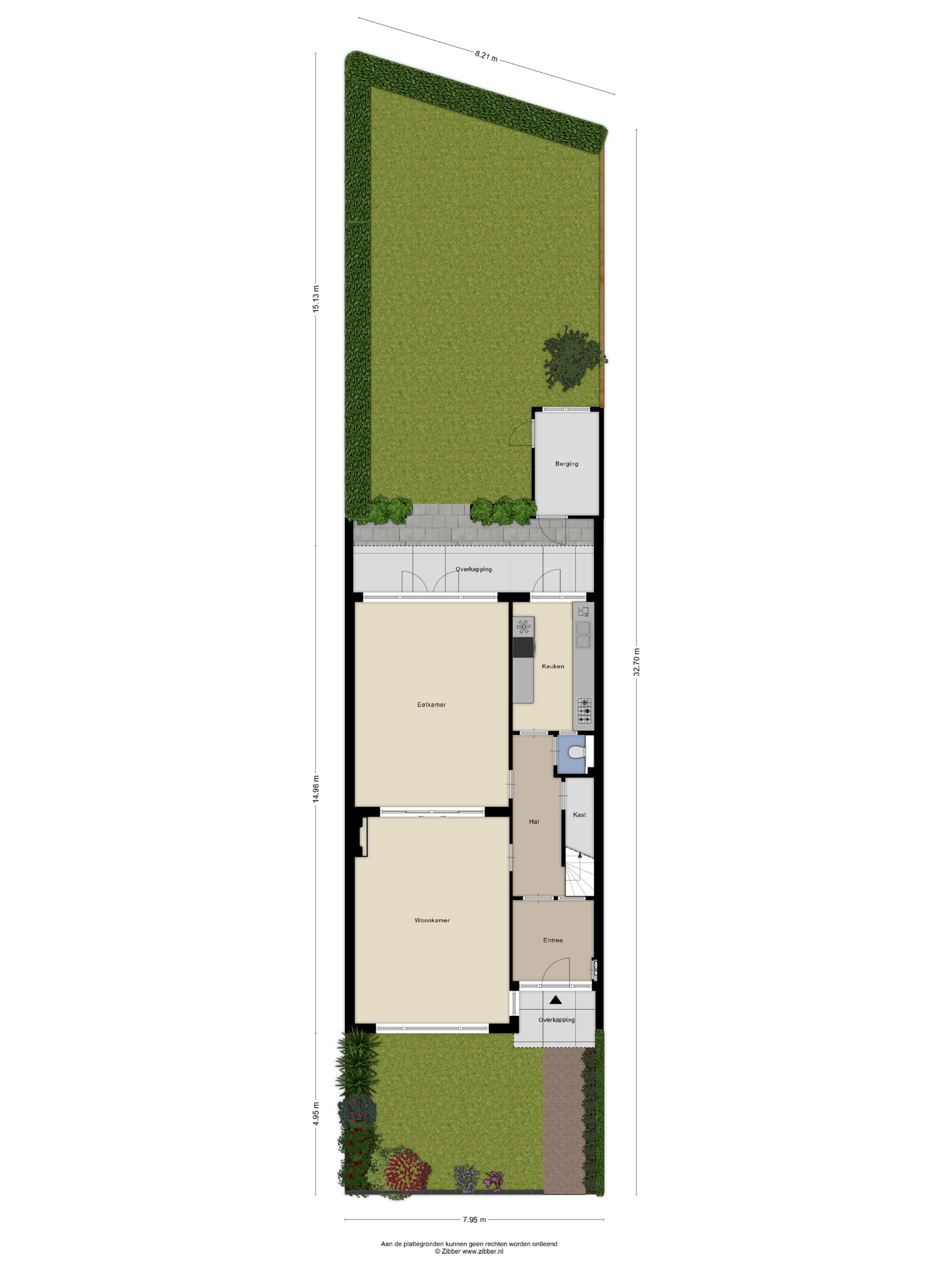 Entree met voorportaal en hal, voorzien van gastentoilet en trapkast. De ruime woonkamer (ca. 60 m²) heeft een houten vloer en en-suitedeuren naar de eetkamer, met openslaande deuren naar de tuin. De moderne keuken is volledig uitgerust en biedt eveneens toegang tot de tuin. De achterzijde grenst niet direct aan buren, waardoor u volop privacy geniet.