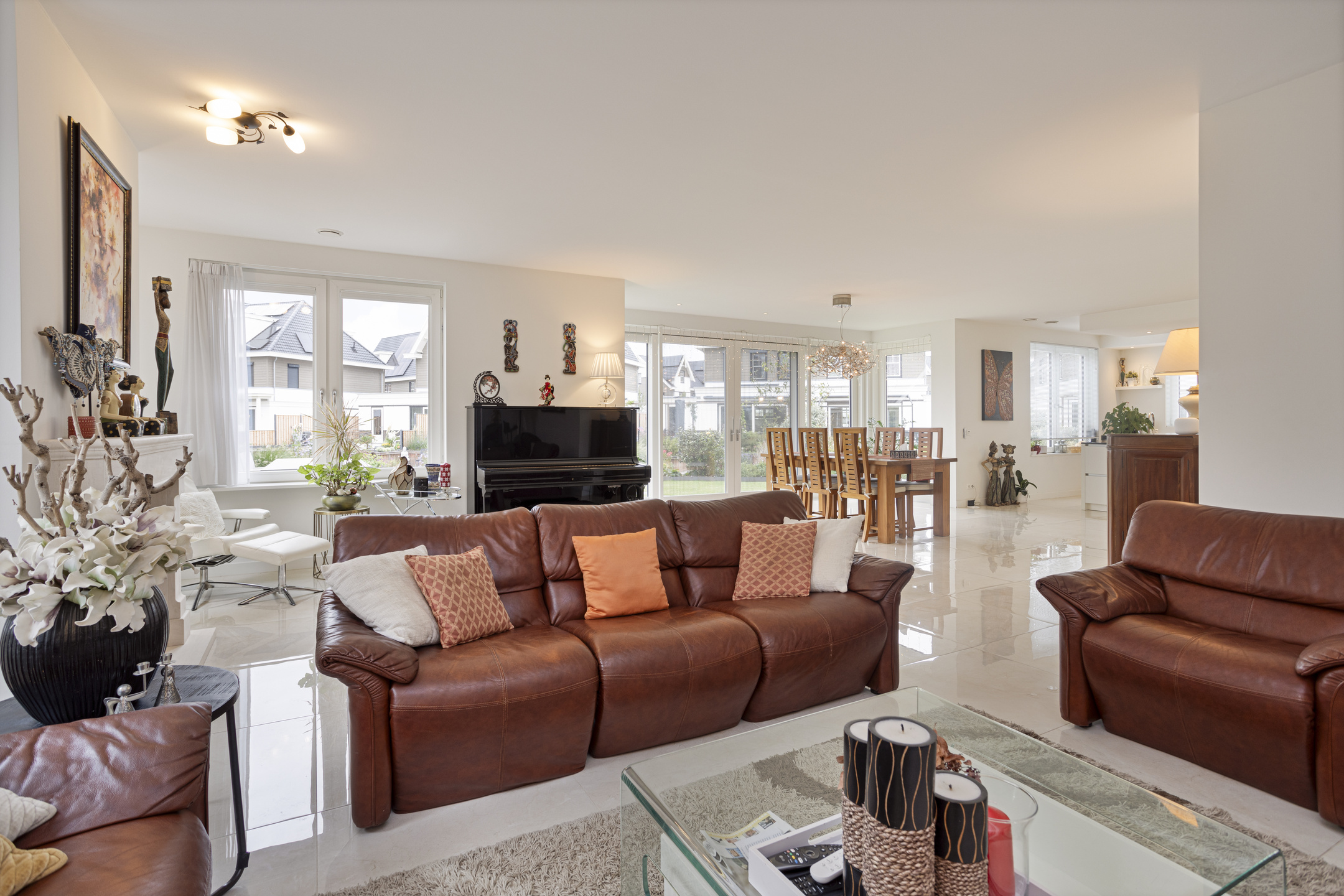 Riante en lichte entree met toilet en opbergkast. Aan de linkerzijde bevindt zich een mooie werk- of speelkamer. Aan de rechterzijde geeft de deur toegang tot de dubbele inpandige garage. Het woongedeelte meet (samen met de keuken) ruim 65 m2 en bestaat uit een ruime en lichte woonkamer met schouw, een eetruimte in het middengedeelte met openslaande deuren naar de tuin en een moderne en luxe open keuken met ‘eiland’ welke uiteraard is voorzien van alle moderne apparatuur.
