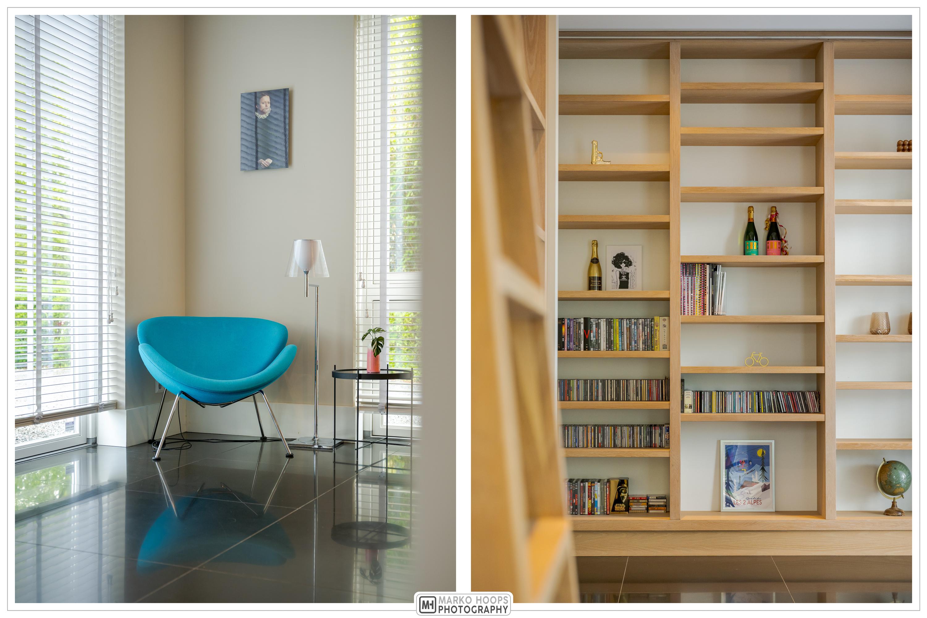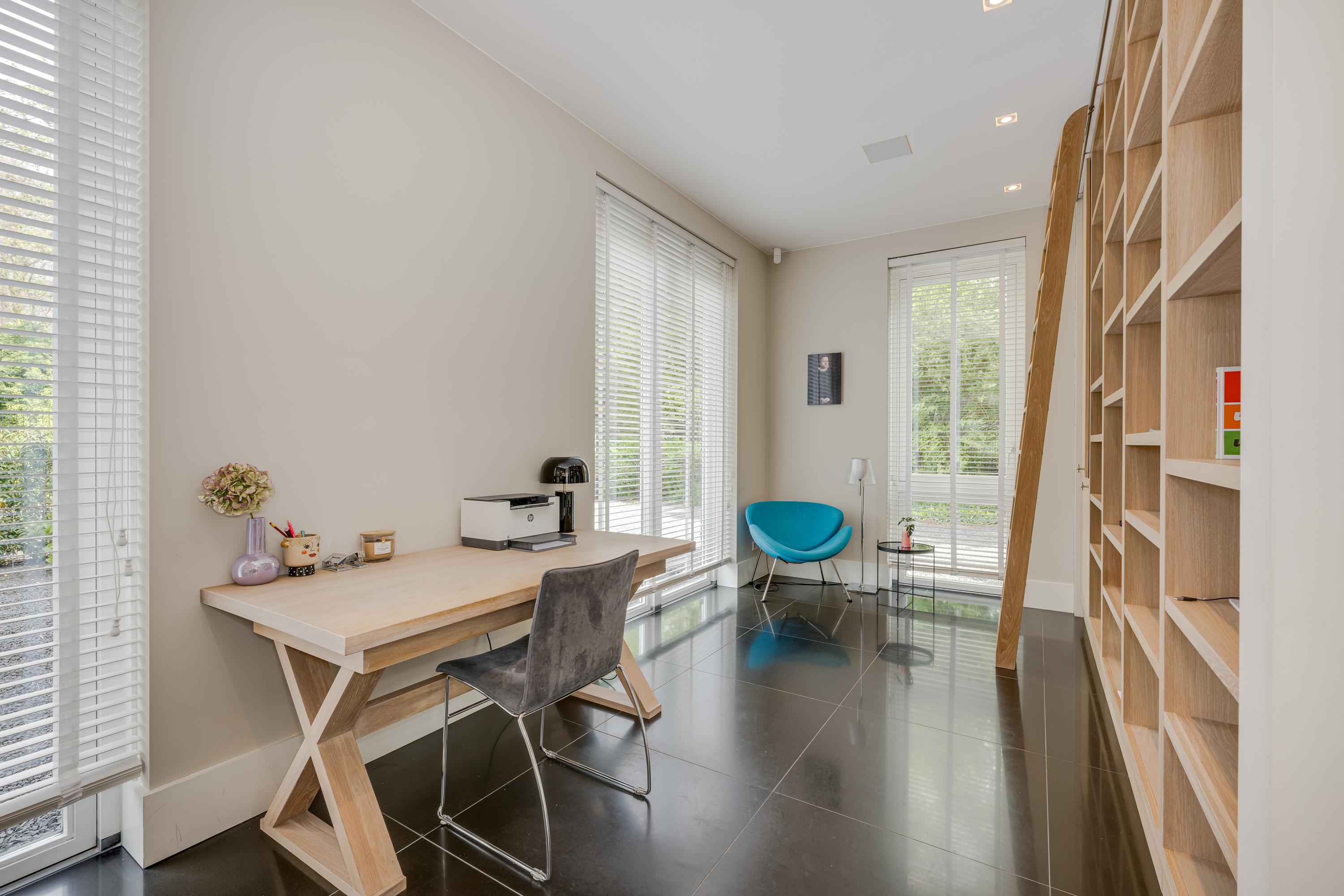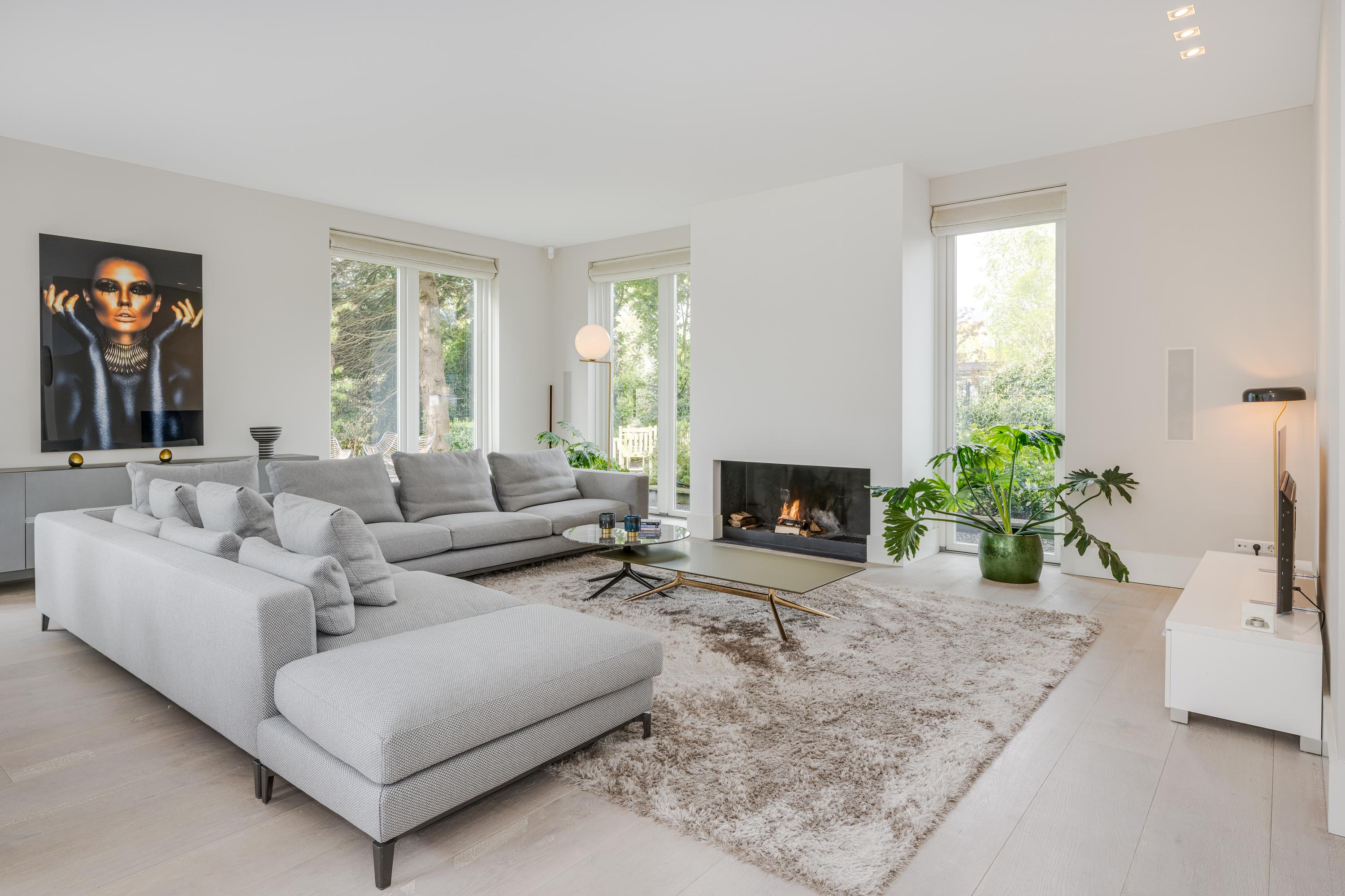 De woonkamer heeft een lichte eiken vloer met een moderne open haard (hout gestookt), hoge ramen en dubbele openslaande deuren naar het terras, waardoor er op elk moment van de dag licht binnenvalt vanuit alle kanten en zicht is op de omliggende tuin. De keuken en de studeerkamer kunnen door moderne schuifdeuren gescheiden worden van de woonkamer, maar geopend vormen deze ruimtes één geheel. De vloer in keuken en werkkamer zijn van hardsteen, welke samen met de elementen van eikenhout en kleuren een fraai effect geven. De werkkamer/bibliotheek is ruim en heeft een ingebouwde boekenwand in L-vorm.