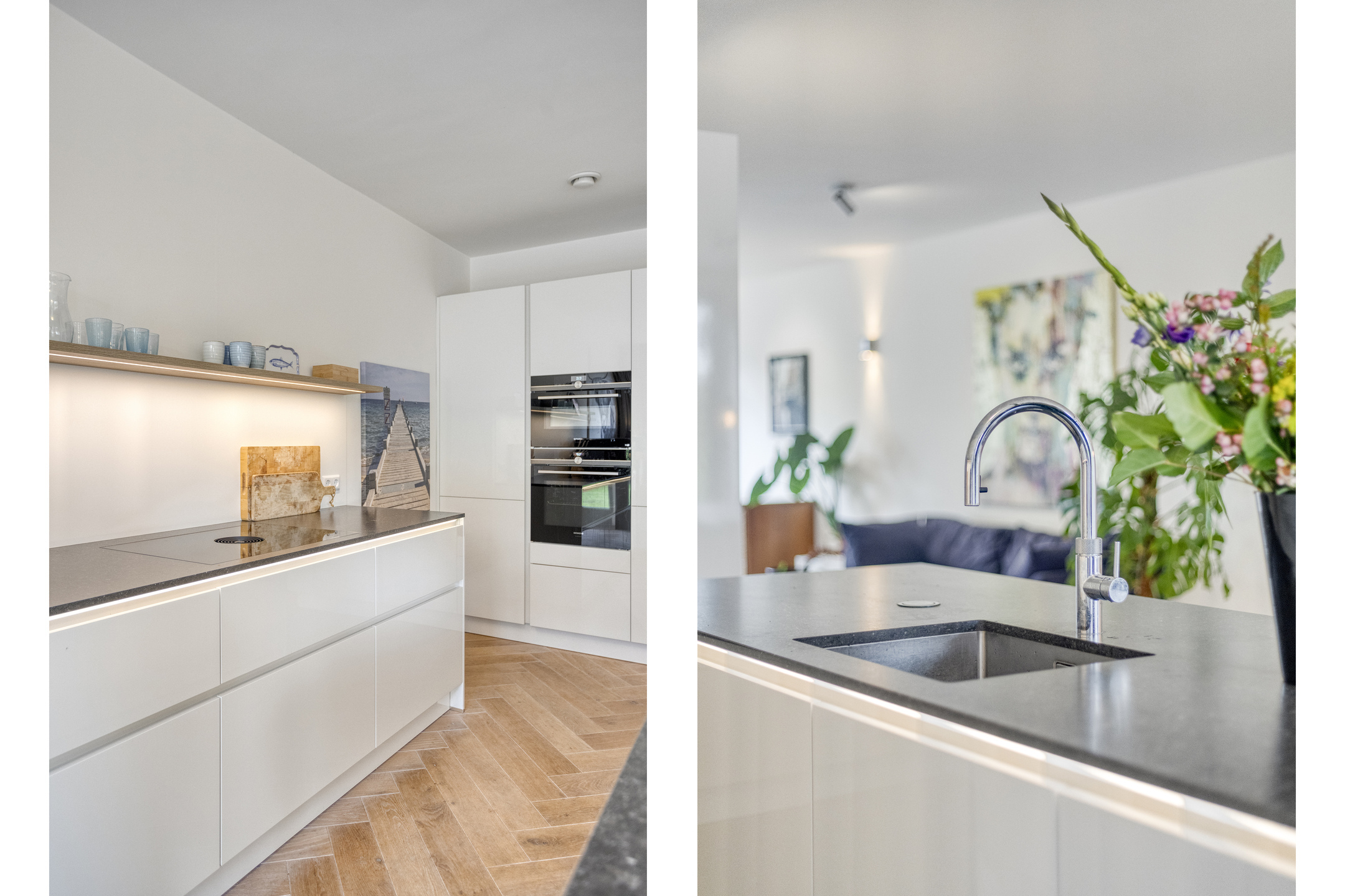 • Begane grond: entree, ruime hal met modern toilet en garderobekast onder de trap. Aan de voorzijde de lichte en ruime L-vormige woonkamer. Aan de achterzijde de riante woonkeuken met kookeiland en luxe inbouwapparatuur (dubbele oven, wijnklimaatkast, fornuis met Bora-afzuigsysteem, Quooker) met twee keer openslaande deuren naar de tuin.