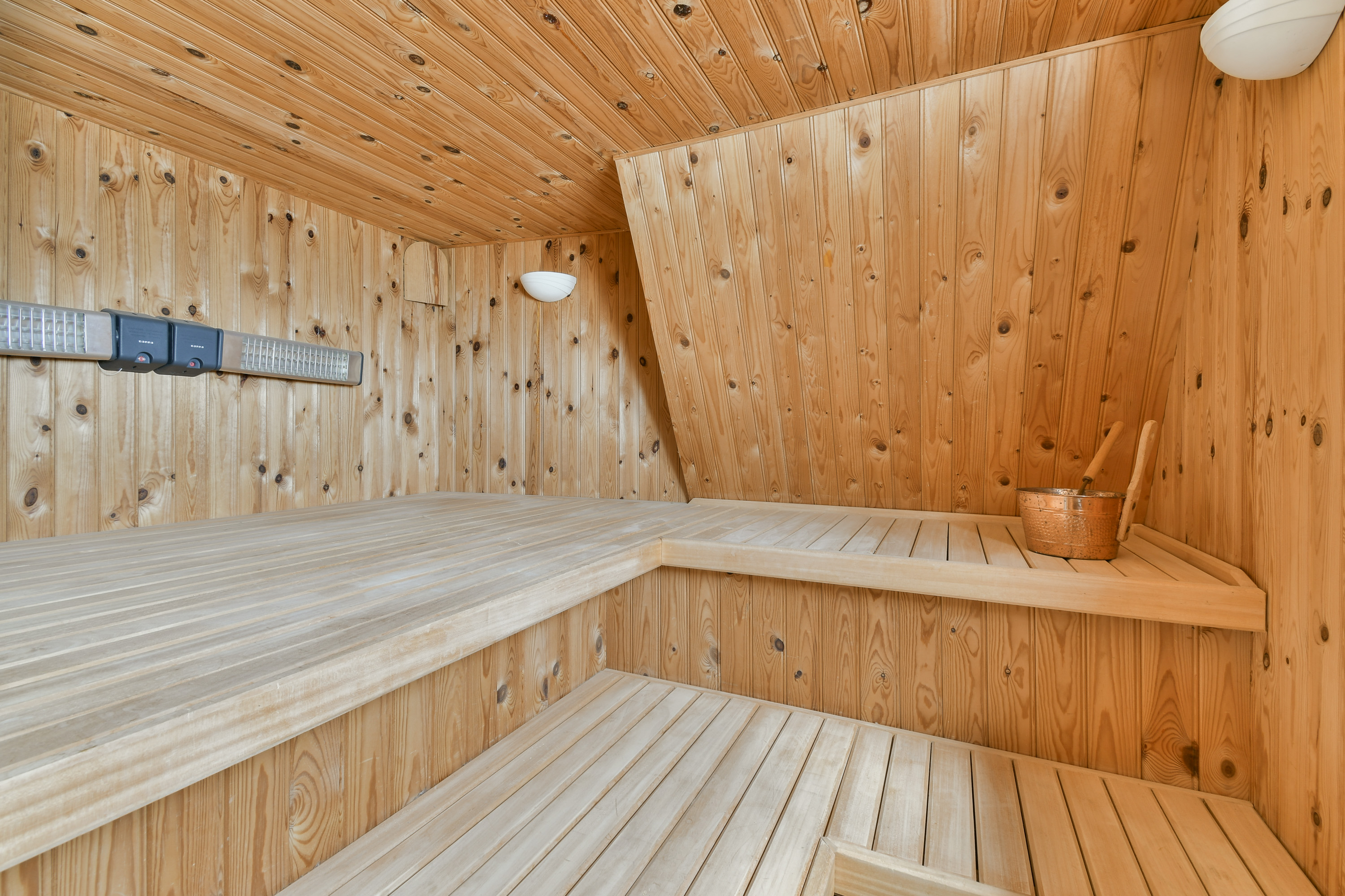 1e verdieping: overloop, sauna, 3e badkamer, 2 slaapkamers, waaronder royale masterbedroom met dubbele deuren / frans balkon.