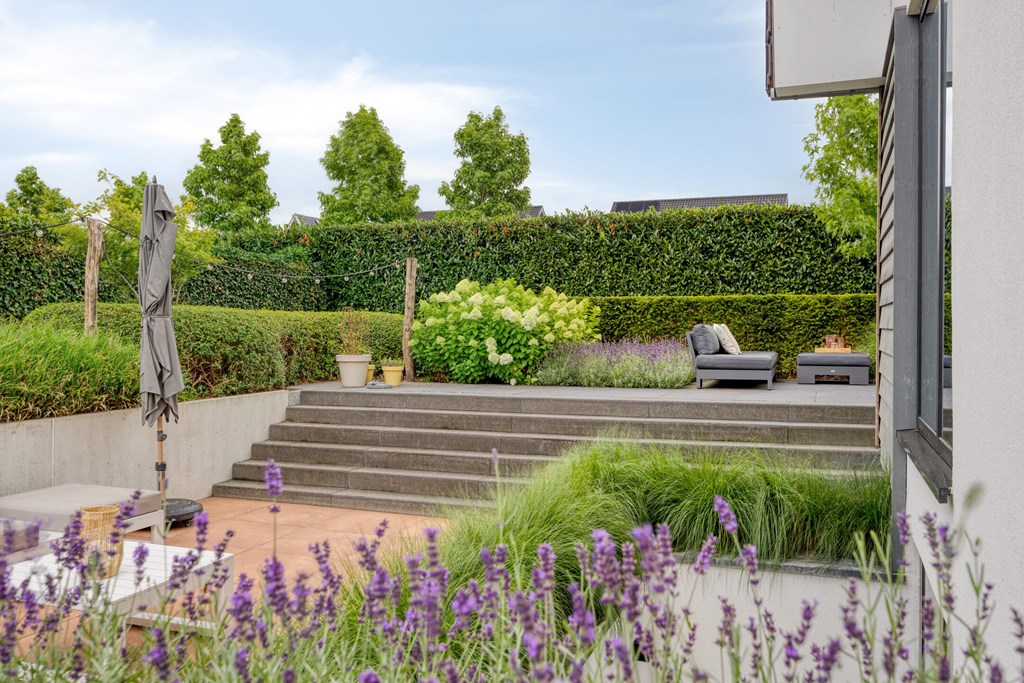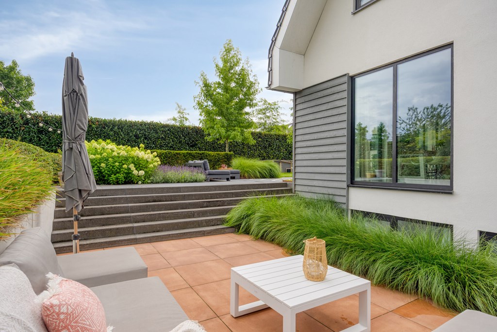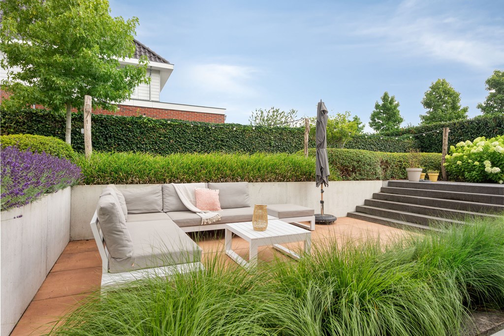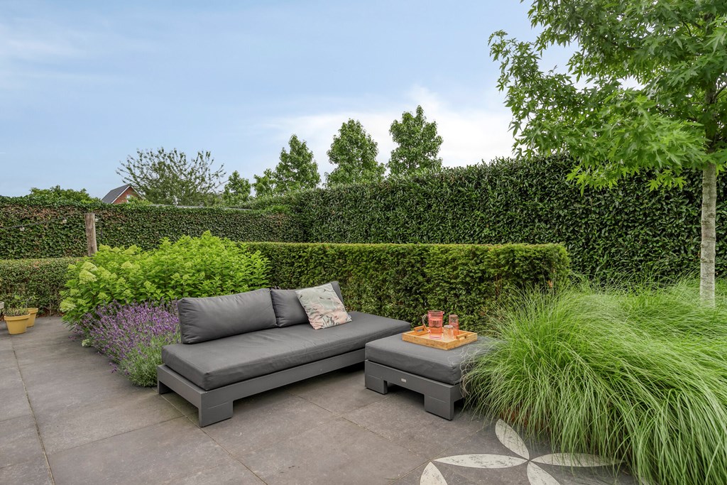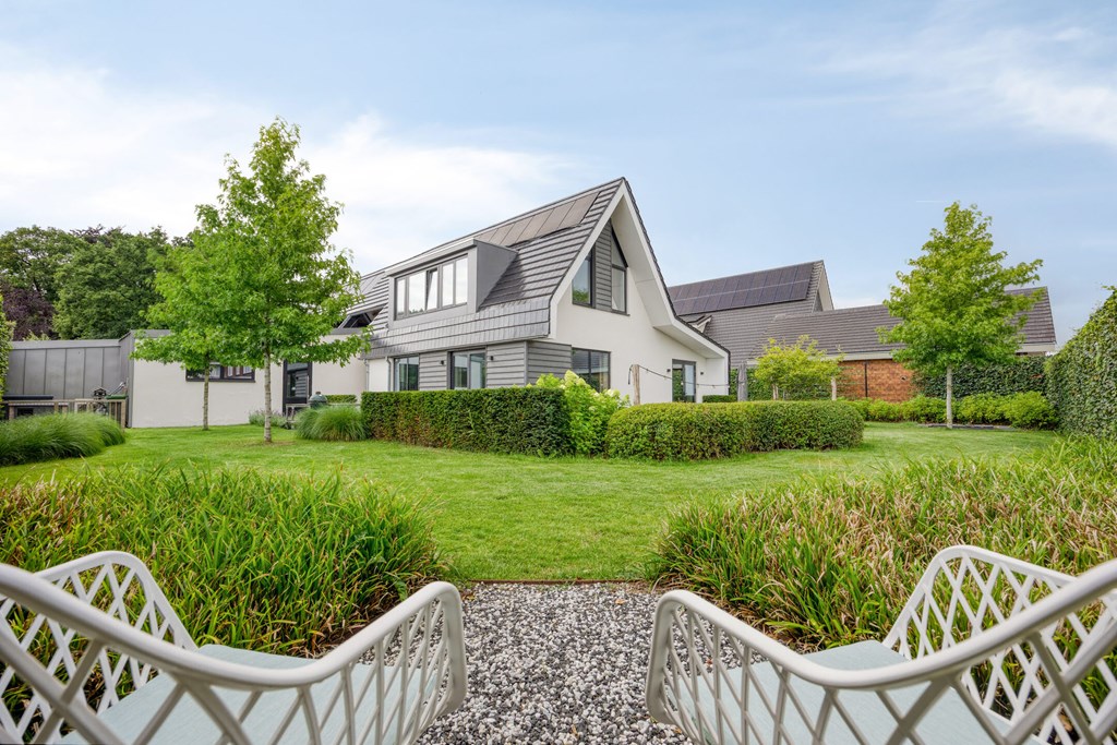 Rondom de woning ligt een fraai aangelegde L-vormige tuin, die maximale privacy en rust biedt. Vanuit de woonkamer en de eetkamer loopt u zo naar buiten, waar u op diverse terrassen geniet van de zon. Een sfeervolle zitkuil en de slimme indeling zorgen ervoor dat u op elk moment van de dag een perfecte plek vindt om te ontspannen. De tuin is met zorg onderhouden en vormt een waar verlengstuk van het woonplezier dat deze woning biedt.