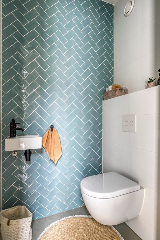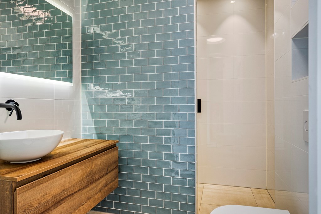 De tweede badkamer sluit naadloos aan op de stijl van de eerste: volledig betegeld, modern en praktisch ingedeeld. U treft hier een royale inloopdouche, een zwevend toilet en een fraai wastafelmeubel met opbergmogelijkheid.
