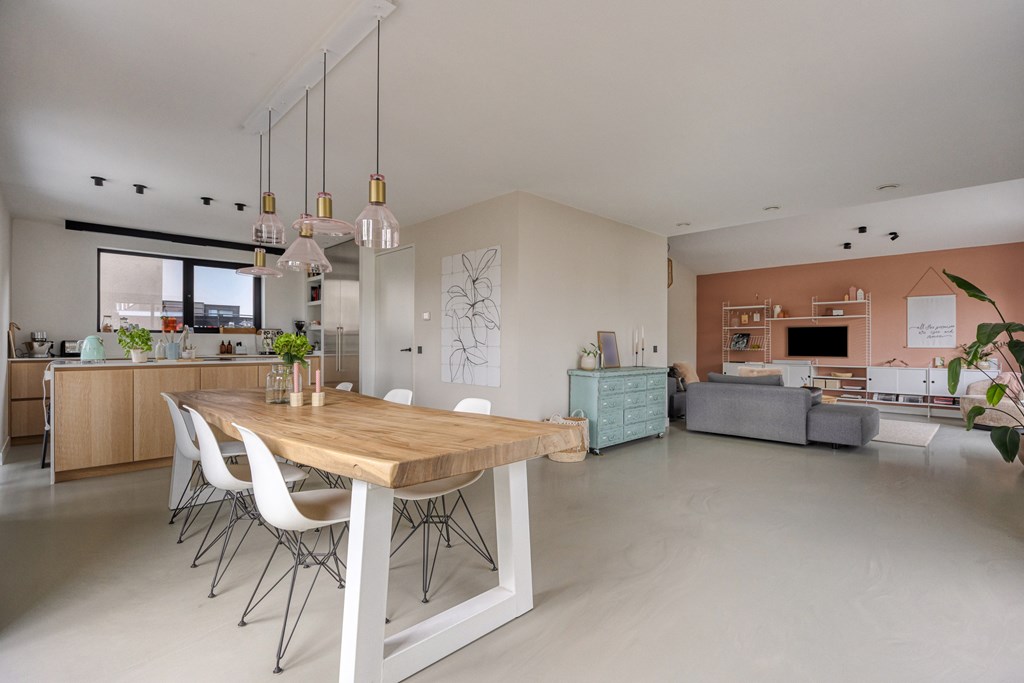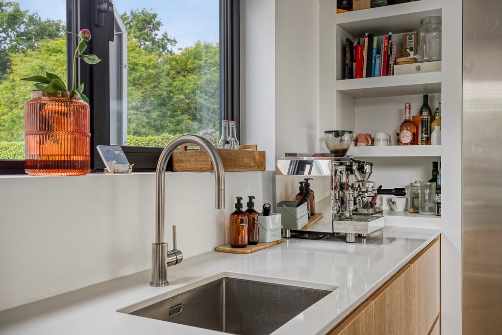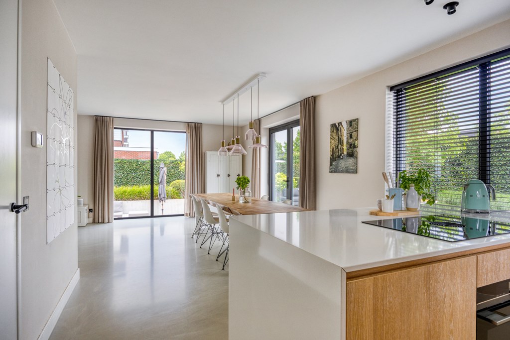 Deze moderne leefkeuken vormt het kloppend hart van de woning. Dankzij het lange aanrechtblad en het kookeiland is koken hier een waar genoegen. De keuken is volledig uitgerust met een inductiekookplaat inclusief geïntegreerde afzuiging, een oven, een vaatwasmachine, een ruime koelkast, een aparte vriezer en een spoelbak. De hoogwaardige afwerking, gecombineerd met praktische opbergruimte in lades en kastjes, geeft de keuken een luxe uitstraling.
