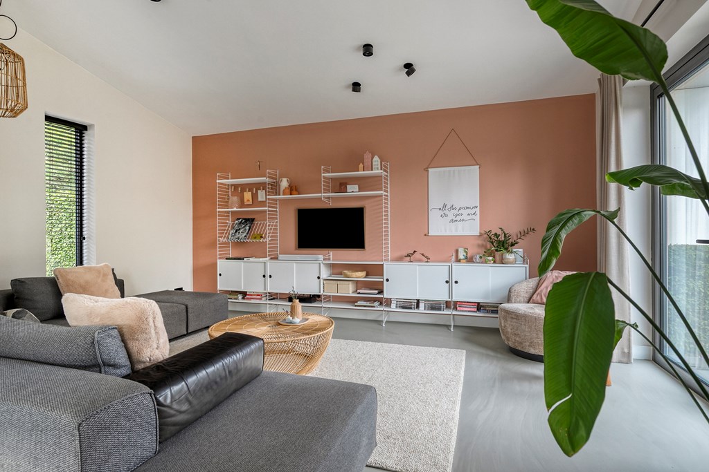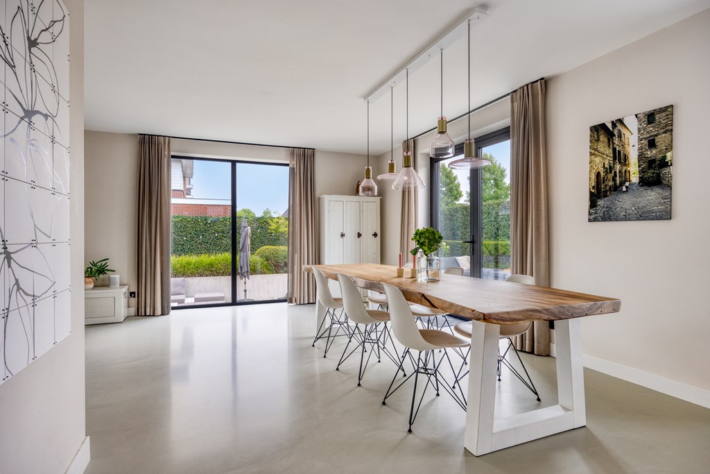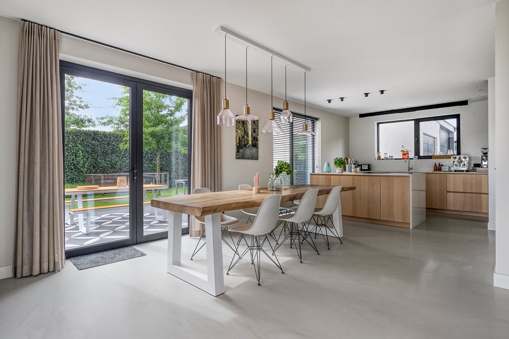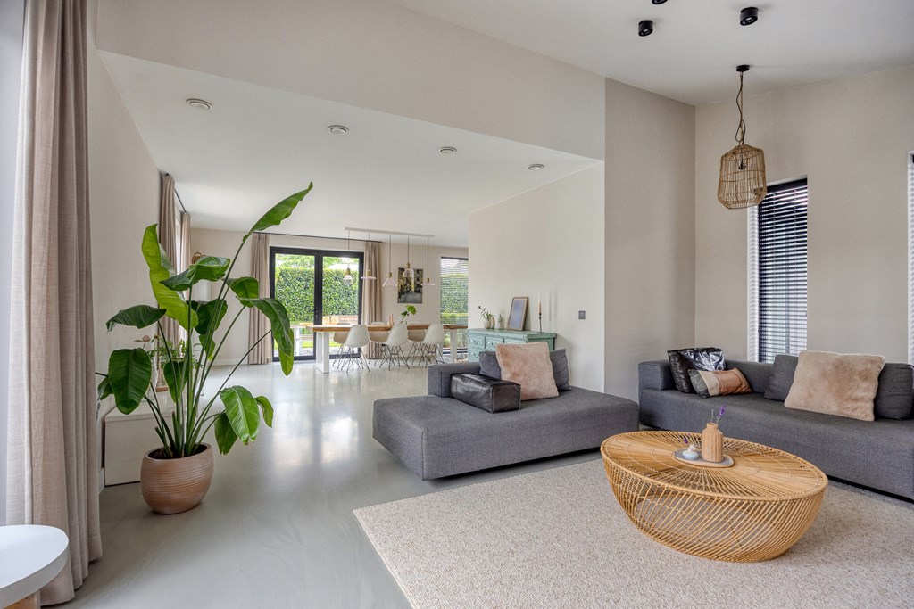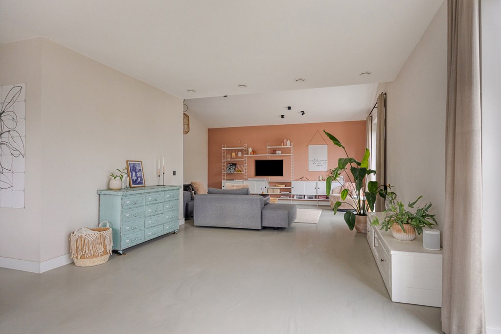 Een aangename verrassing is de royale woonkamer, die dankzij grote raampartijen baadt in natuurlijk daglicht. De open indeling geeft u alle vrijheid om een comfortabele zithoek én een uitnodigende ontvangstplek te creëren. Openslaande deuren verbinden binnen moeiteloos met buiten, waardoor de tuin als vanzelf een verlengstuk van uw leefruimte wordt.