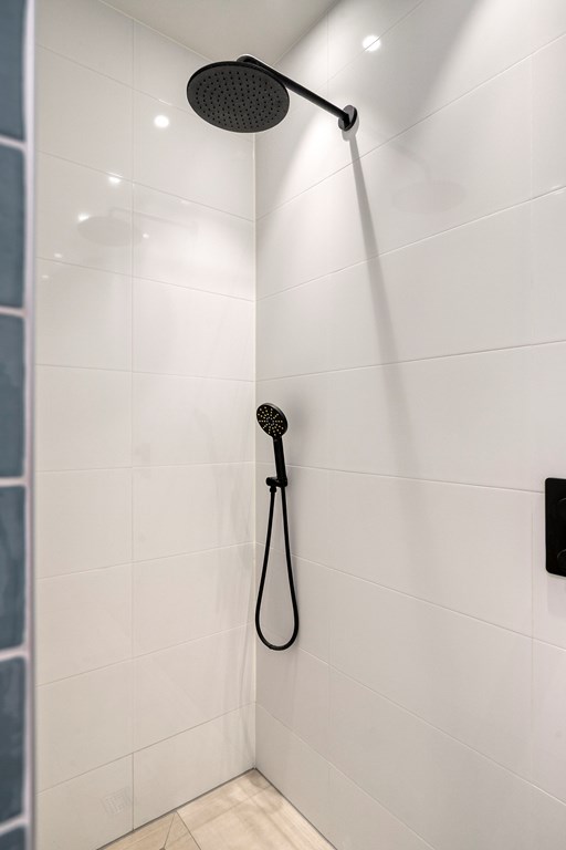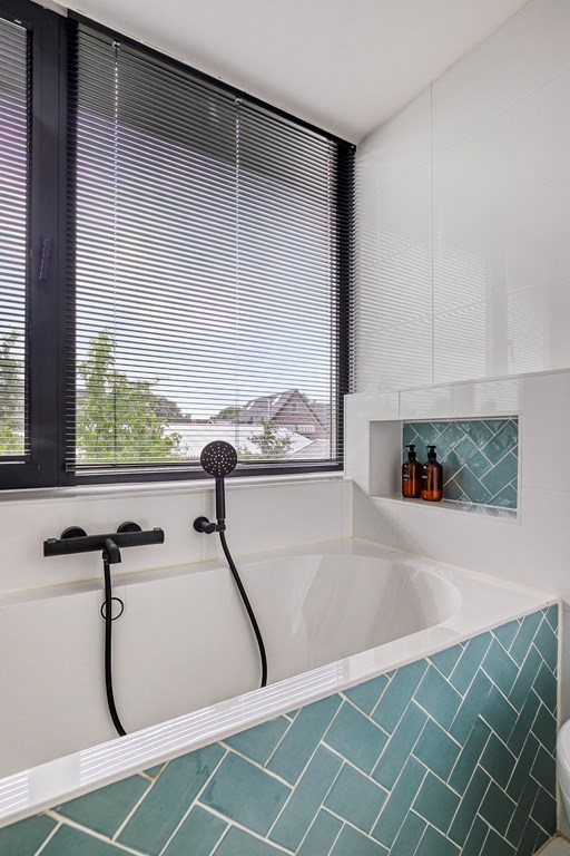 Aan de overloop grenst de modern afgewerkte badkamer. Deze is volledig betegeld en voorzien van een ligbad een ruime inloopdouche met glazen deur, een zwevend toilet en een stijlvol wastafelmeubel. De strakke afwerking draagt bij aan een luxe en verzorgde uitstraling.