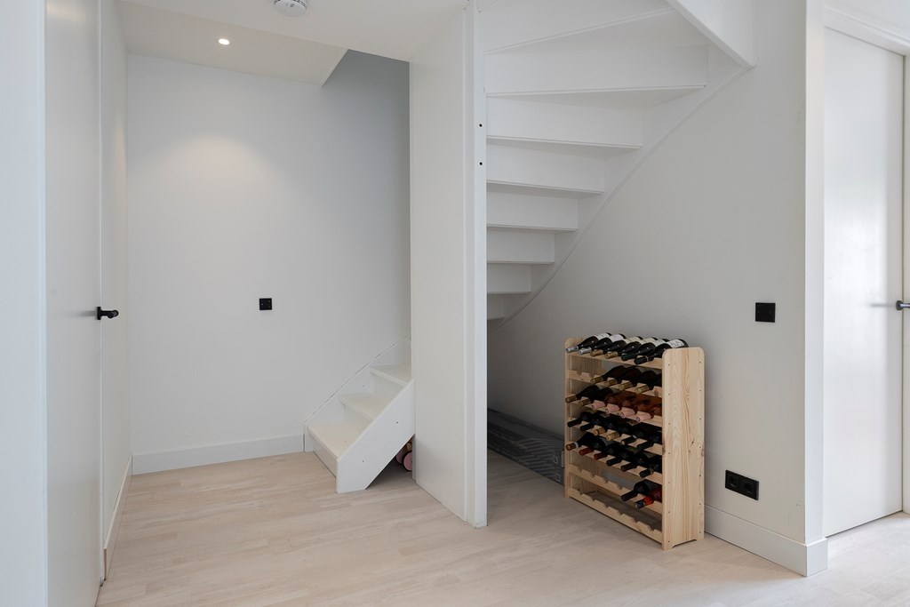 Een praktische ruimte in het souterrain biedt volop opbergmogelijkheden. Hier zijn tevens de witgoedaansluitingen en de cv-installatie ondergebracht, wat het geheel tot een functioneel geheel maakt.