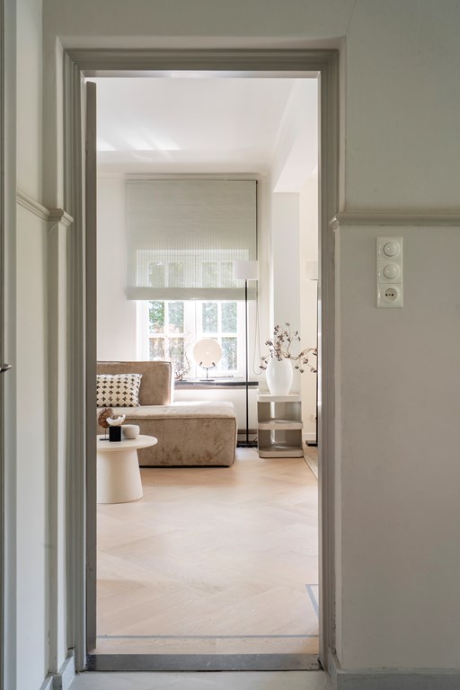 De woonkamer is een ware blikvanger met zijn visgraatvloer en elegante inrichting. Deze riante ruimte is slim ingedeeld en biedt meerdere gezellige zitplekken, waardoor u kunt genieten van de verschillende hoeken en uitzichten in de kamer. De overvloed aan ramen zorgt voor een prachtige lichtinval gedurende de dag, wat bijdraagt aan een lichte en open sfeer. Hier kunt u ontspannen met een goed boek of gasten ontvangen in een stijlvolle setting.