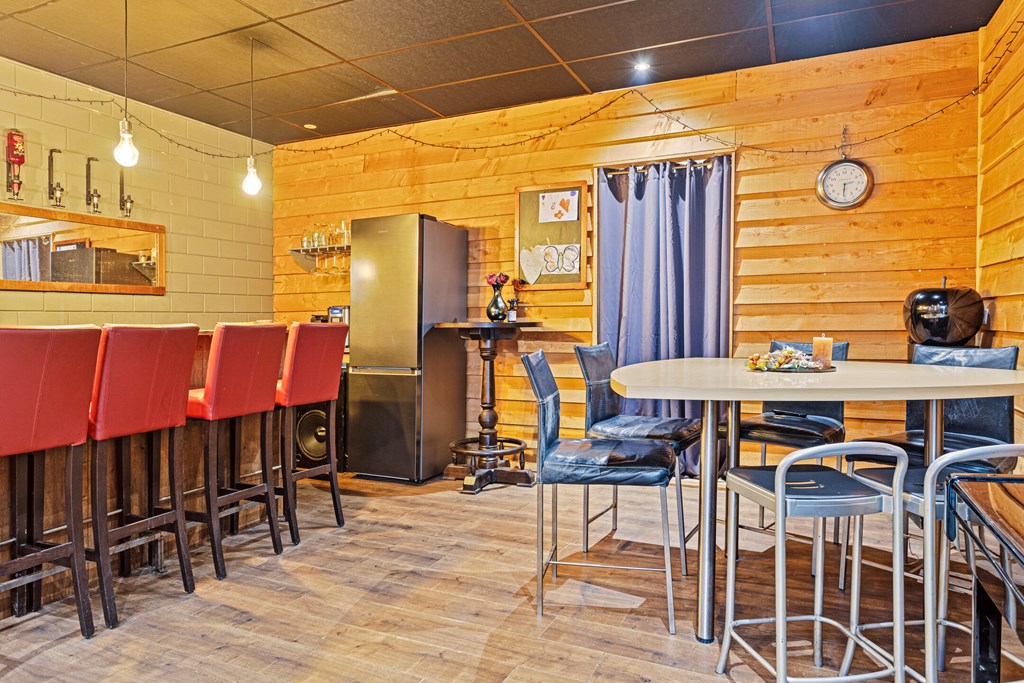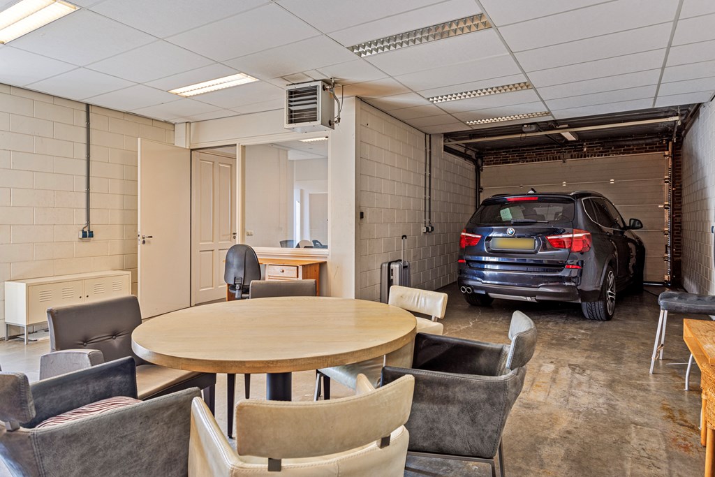 Aangrenzend ligt de royale garage, bereikbaar via een elektrische overheaddeur, met ruimte voor meerdere auto's. Achterin de garage bevinden zich een praktisch keukenblok en een toiletruimte met fontein.