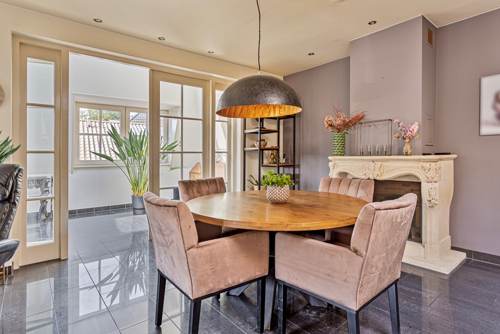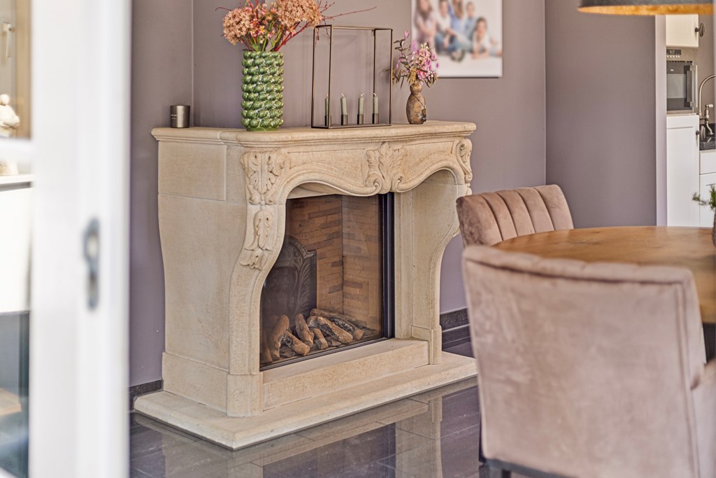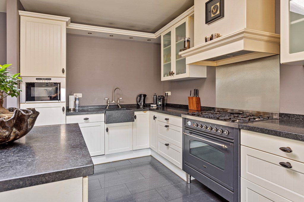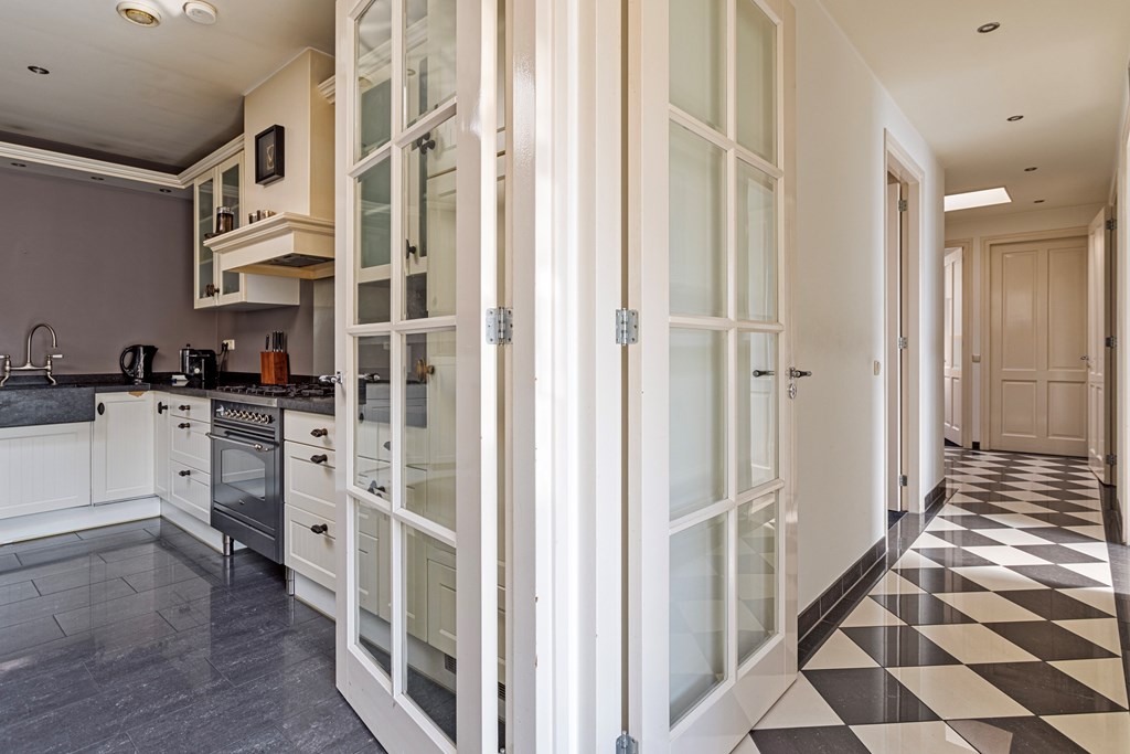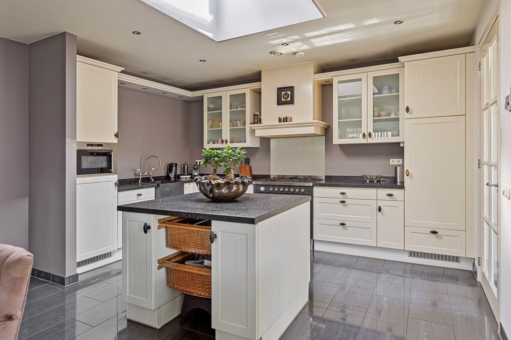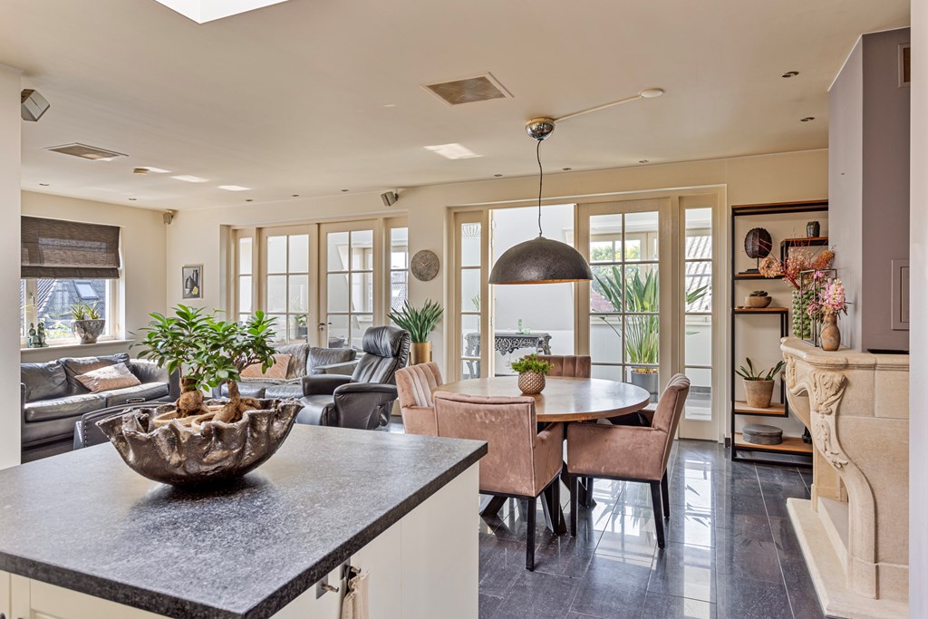 Op de eerste verdieping komt u via de trap of de geplaatste lift in de hal. Door de hal kom je bij de riante living met open keuken die is voorzien van een stijlvolle natuurstenen vloer. Het kookeiland in de keuken biedt meer dan voldoende werkruimte en geeft een fraai uitzicht op de eethoek. De open keuken is voorzien van een modern kookeiland en uitgerust met luxe apparatuur, waaronder een Boretti gasfornuis.