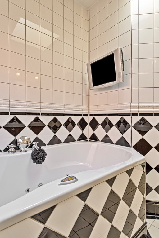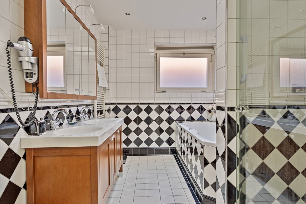 De ruime badkamer biedt meerdere faciliteiten om heerlijk tot rust te komen. Zo is er een royale stortdouche, en een comfortabel bubbelbad waarin u kunt genieten van een ontspannen moment na een lange dag. Het wastafelmeubel is voorzien van een dubbele wastafel, waardoor u voldoende ruimte heeft om samen de dag te beginnen.