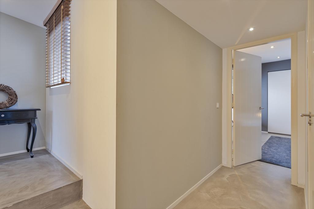 Begane grond: entree, ruime ontvangsthal en doorgang naar de linker- en achtervleugel van de woning met leuke, speelse hoogte verschillen en een knusse, doch ruime TV- kamer (ca. 22 m2) met haardpartij, eetkamer (ca. 30 m2) met fraai tuincontact en de zeer fraaie leef- keuken (ca. 36 m2) eveneens met prachtig tuincontact. De zij- en achtertuin zijn middels een viertal schuifpuien te bereiken. Alle ruimtes zijn of met een betonlook vloer of met een houten visgraad vloer afgewerkt. De keuken is uitgevoerd in een eilandopstelling en voorzien van alle benodigde inbouwapparatuur.