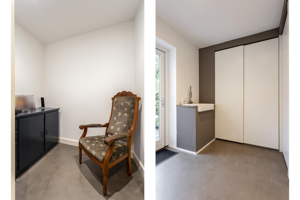 Verder bevindt zich op de begane grond nog een handige bijkeuken met opstelling van het witgoed en CV- installatie, toiletruimte met hangend toilet en fonteintje en een kantoortje of berging.