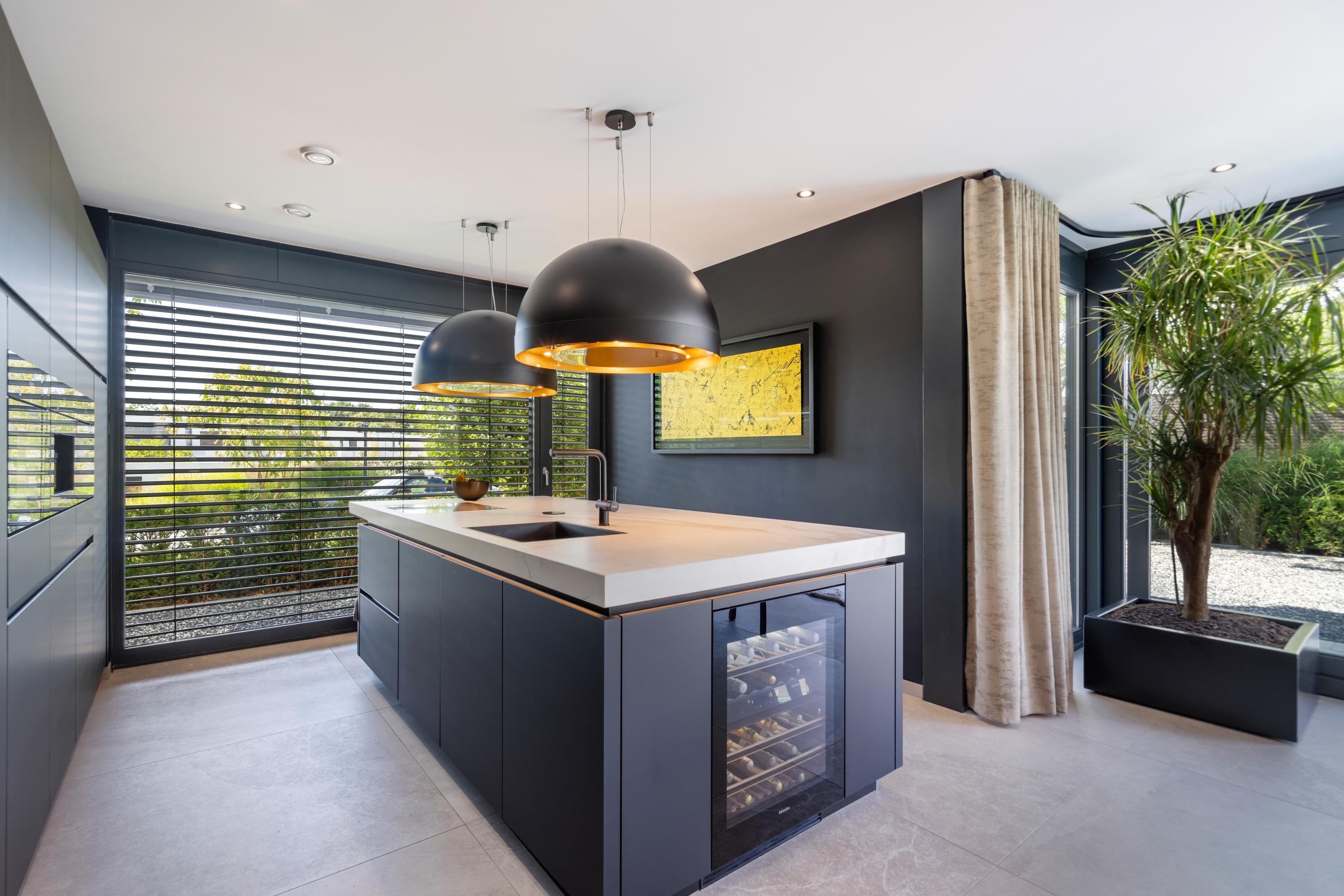 De luxe keuken aan de voorzijde van de woning is voorzien van Miele inbouwapparatuur, onder andere koffieautomaat, heteluchtoven, stoomoven, Bora inductiekookplaat met geïntegreerde afzuiging, vaatwasser, een wijnklimaatkast en diverse opbergkastjes en lades. Vanuit de keuken is goed zicht op de prachtig aangelegde voortuin.