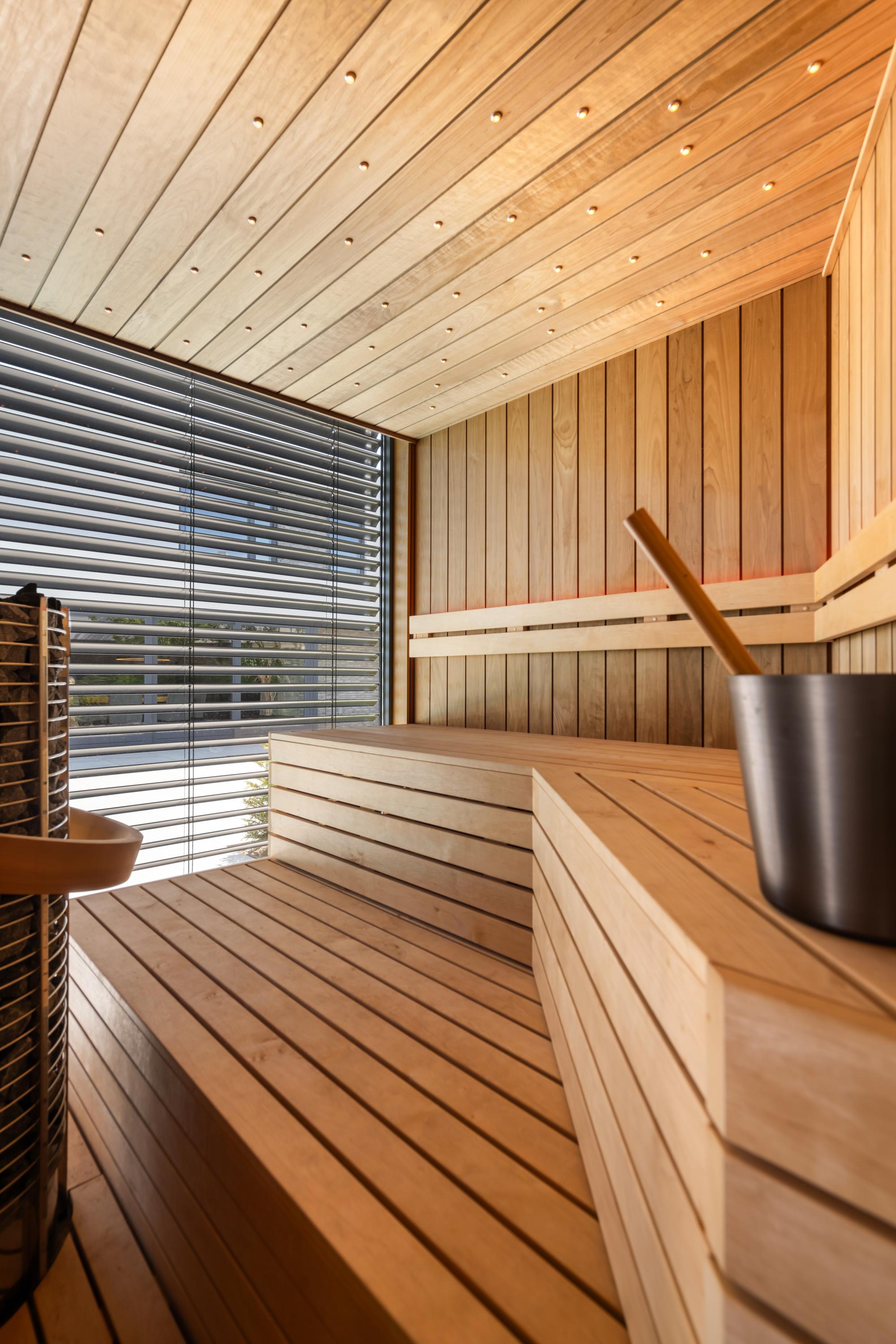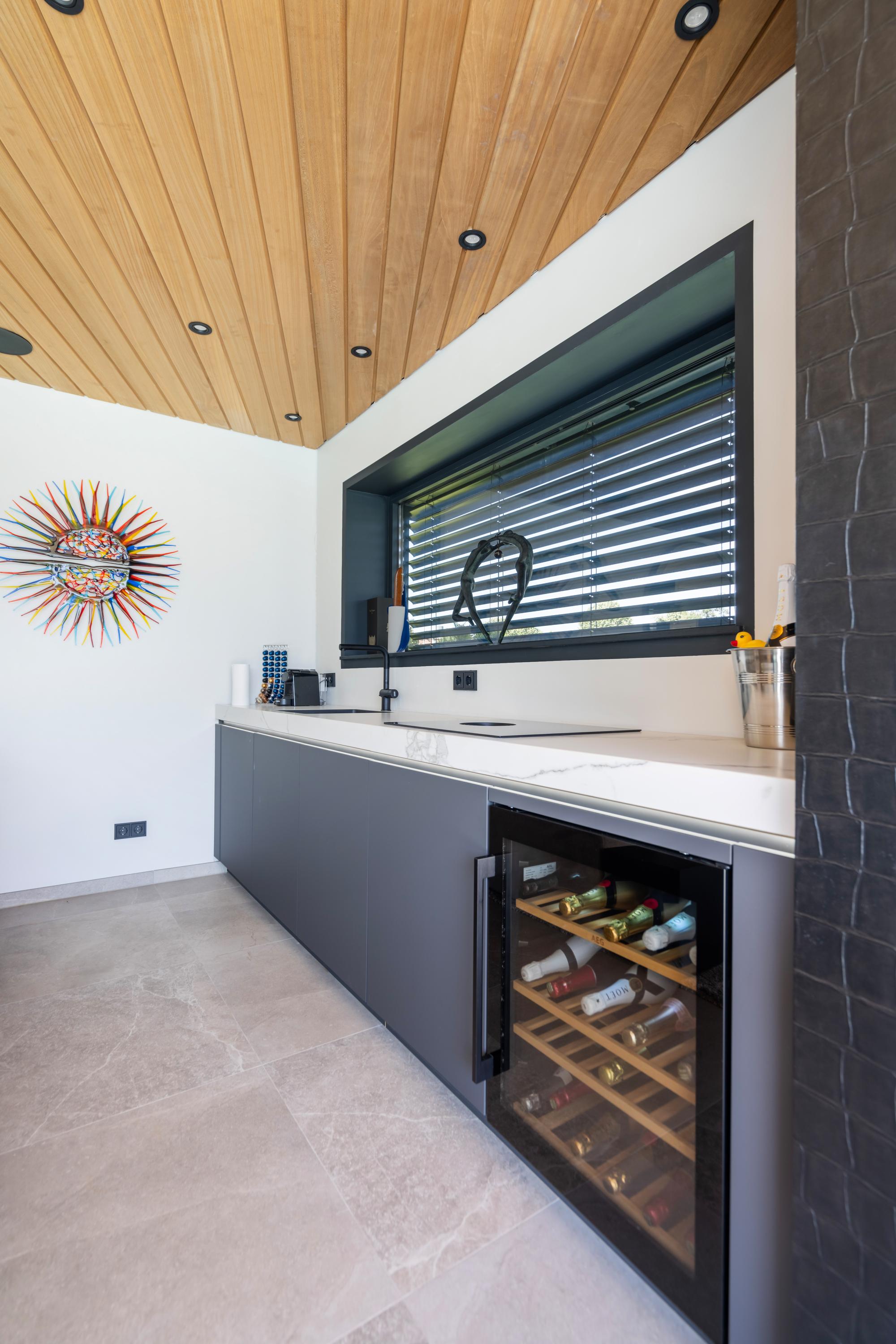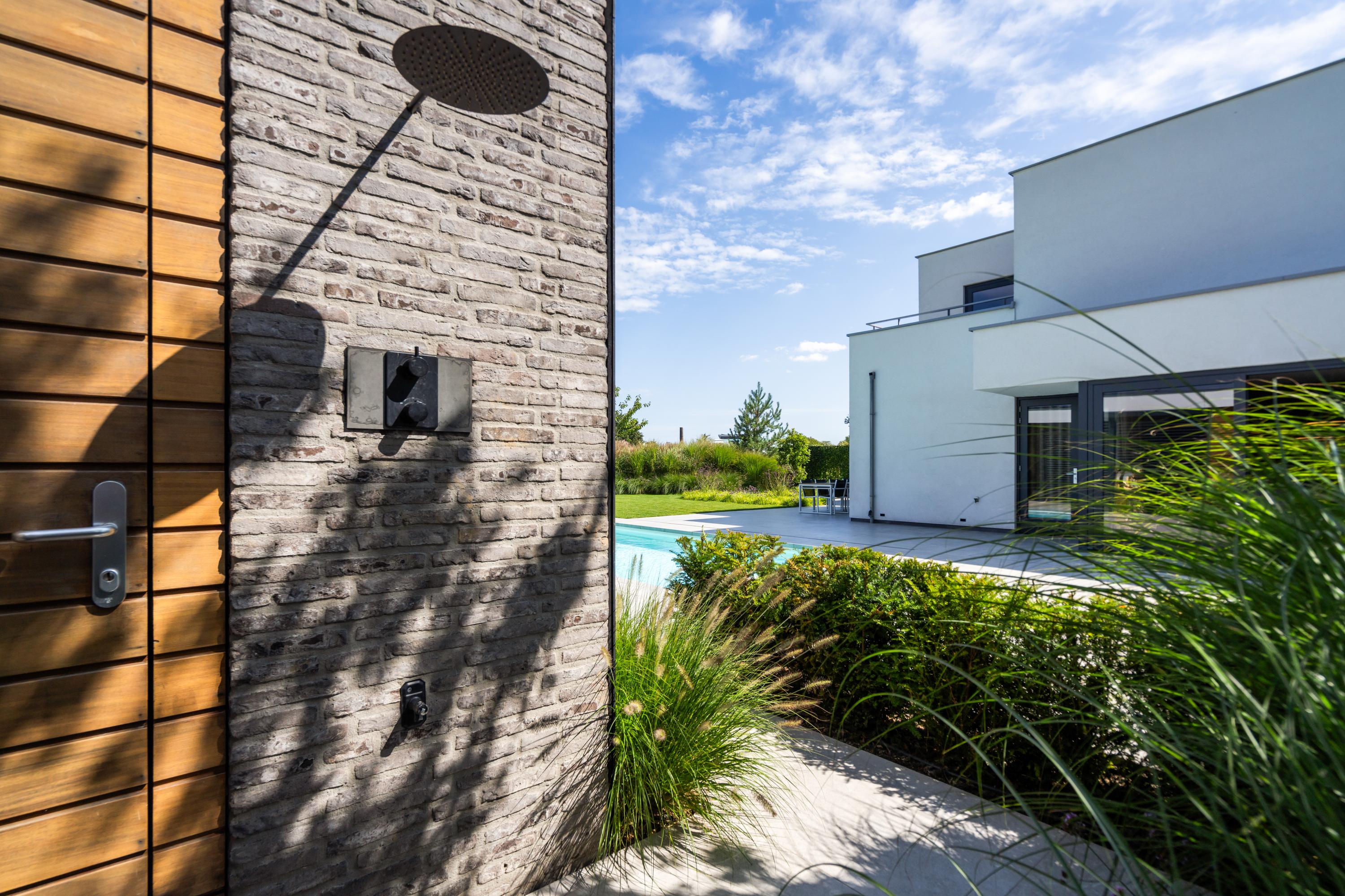 De royale zijtuin en achtertuin zijn met dezelfde kwaliteit aangelegd. Een absoluut hoogtepunt is het luxe afgewerkte poolhouse in combinatie met een eigen sauna en een zwembad. De zorgvuldig uitgekozen houten, Finse afwerking in het interieur van deze poolhouse, zorgt voor een ultiem wellness gevoel. Bij binnenkomst valt meteen de verdraaibare houtkachel op die in de ruimte aanwezig is, een échte eye-catcher. Dit exclusieve buitenverblijf (inclusief overkapping circa 55 m2) maakt het mogelijk om het hele jaar door te genieten van ontspanning en comfort in eigen tuin. Of het nu gaat om een verfrissende duik op een zomerse dag in het zwembad of een sfeervolle avond met familie en vrienden — deze buitenruimte biedt het ultieme vakantiegevoel aan huis. De poolhouse is tevens voorzien van een keukenblok met spoelbak, wijnklimaatkast, koelkast, inductiekookplaat met Bora-afzuiging en diverse opbergkasten. Ook is er een muziekinstallatie met inbouwspots aanwezig. Aan de buitenzijde is er een buitendouche met themostaatkraan aanwezig. Er is een aparte ruimte waar alle installaties opgesteld zijn.