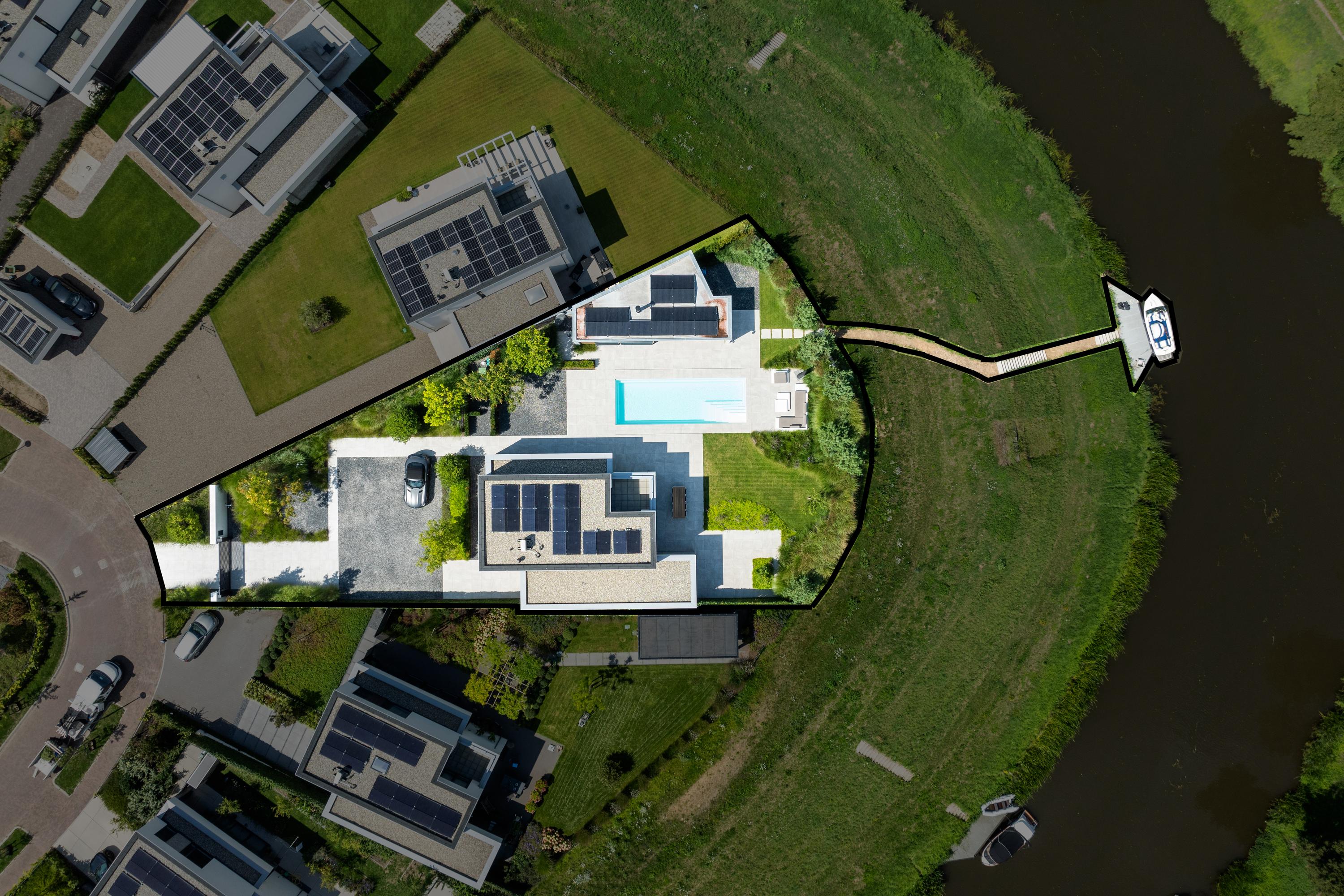 Meerdere terrassen in de tuin nodigen uit tot lange diners, gezellige borrels of rustige momenten in de zon. De tuin is verder aangelegd met onder andere gazon, split en diverse beplantingen. Hier is een perfecte balans tussen groen en het moderne karakter van het huis. Vanuit je tuin loop je de trap omlaag naar je eigen aanlegsteiger, zodat je vanuit hier zo je boot in kunt stappen. In enkele minuten vaar je naar de Maas en de Maasplassen zodat je kan genieten van een dagje op het water.