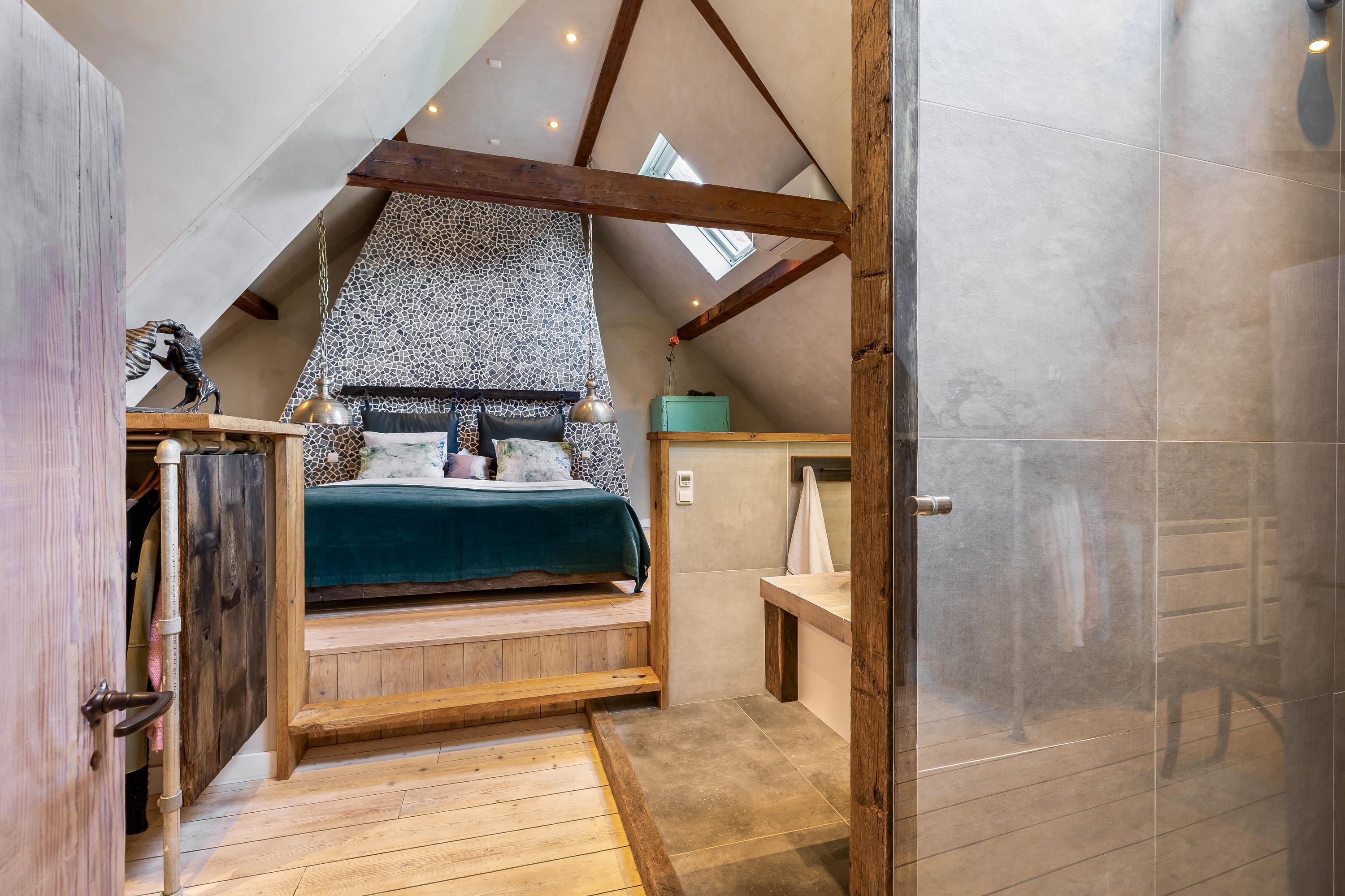 De absolute blikvanger is de wellnessruimte in de voormalige stal. Hier is een luxe binnenzwembad gerealiseerd met automatisch roldek, grote jacuzzi, fitnessruimte en voorbereidingen voor een sauna – alles omgeven door originele stalramen en robuuste houten spanten.