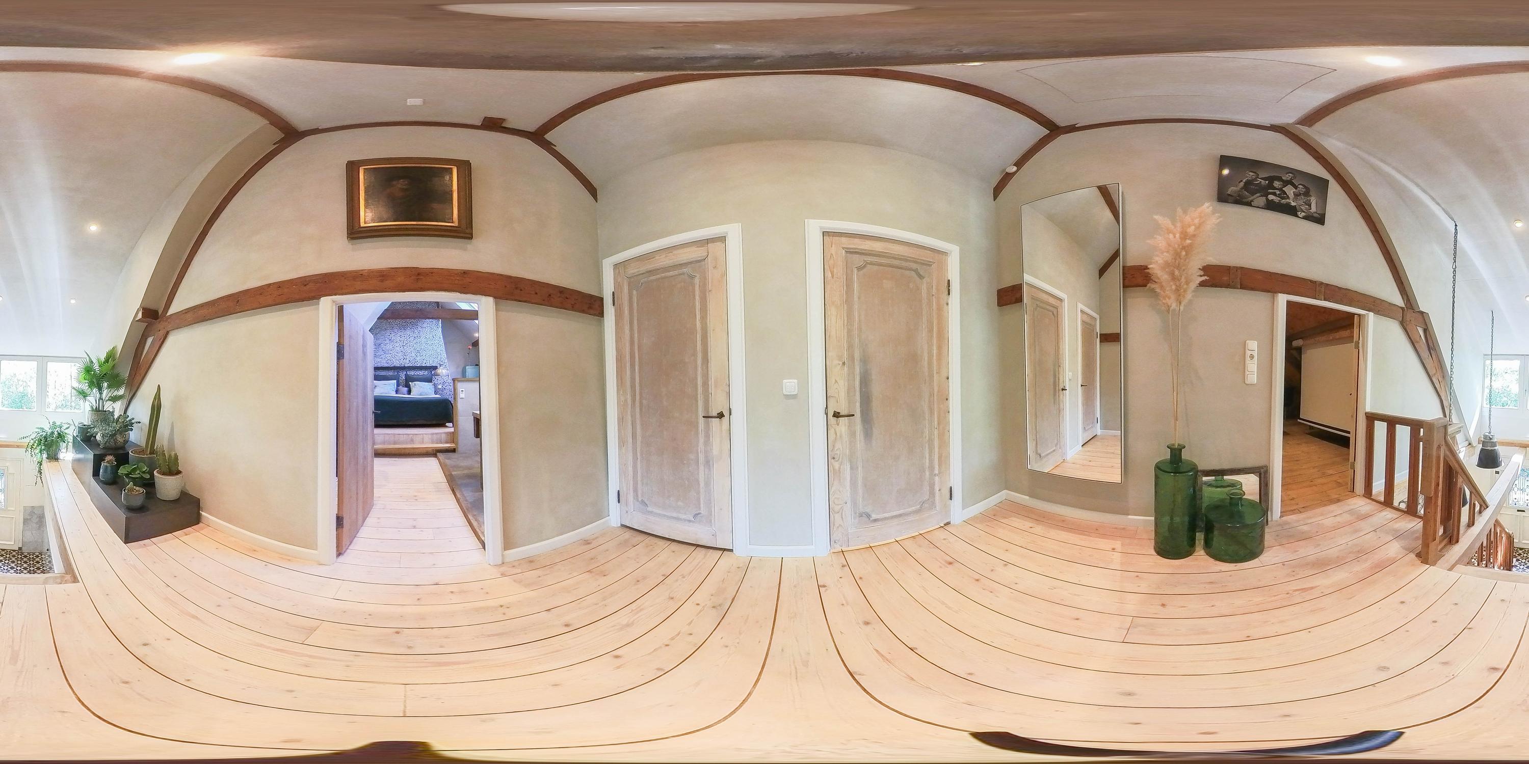 Fraaie trappartij, ruime overloop met dakkapel, apart toilet en inloopkast, riante slaapkamer met 2 nieuwe dakramen badkamer en suite uit 2020 met inloopdouche, 2 wastafels en vloerverwarming, amusementsruimte met biljart en bioscoop, die eventueel ook prima te gebruiken is als slaapkamer en doorgang met loopbrug over het zwembad naar de achterste slaapkamer met houten vloerdelen.