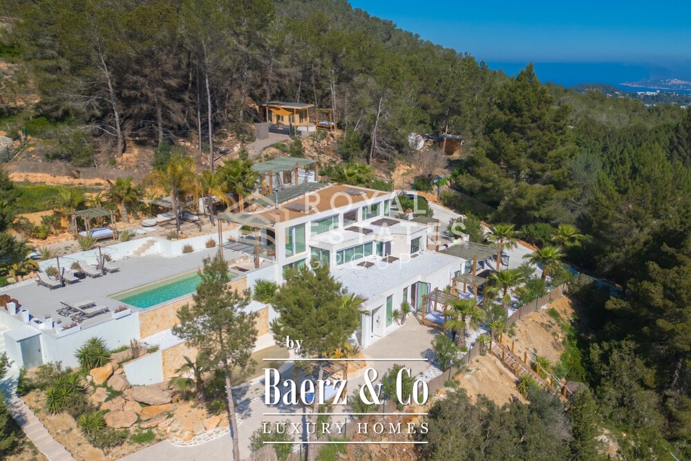 Villa San Jose met panoramisch uitzicht ligt rustig verscholen tussen de groene heuvels van het westen van Ibiza en biedt een zeldzaam gevoel van rust en ruimte. Met een royaal perceel van 19.600 m² en een woonoppervlak van 330 m² geniet u van volledige privacy, omringd door mediterrane natuur en glooiende heuvels. Strategisch geplaatste uitzichtpunten op het terrein bieden brede vergezichten over het landschap, met subtiele glimpjes van de verre zee.