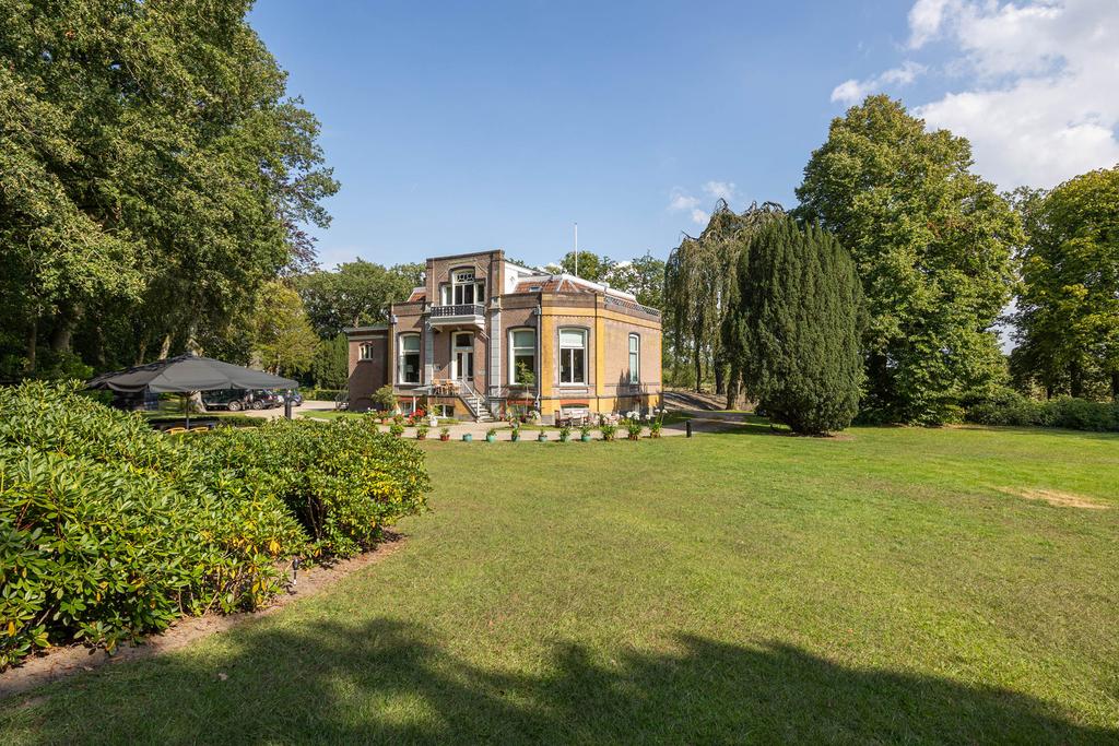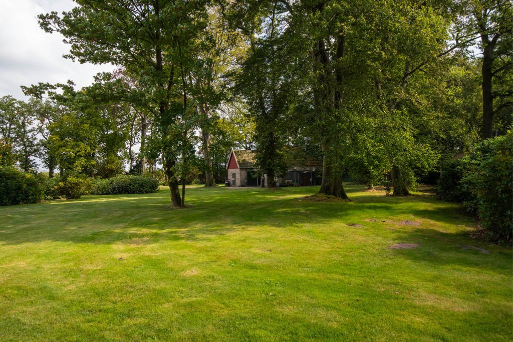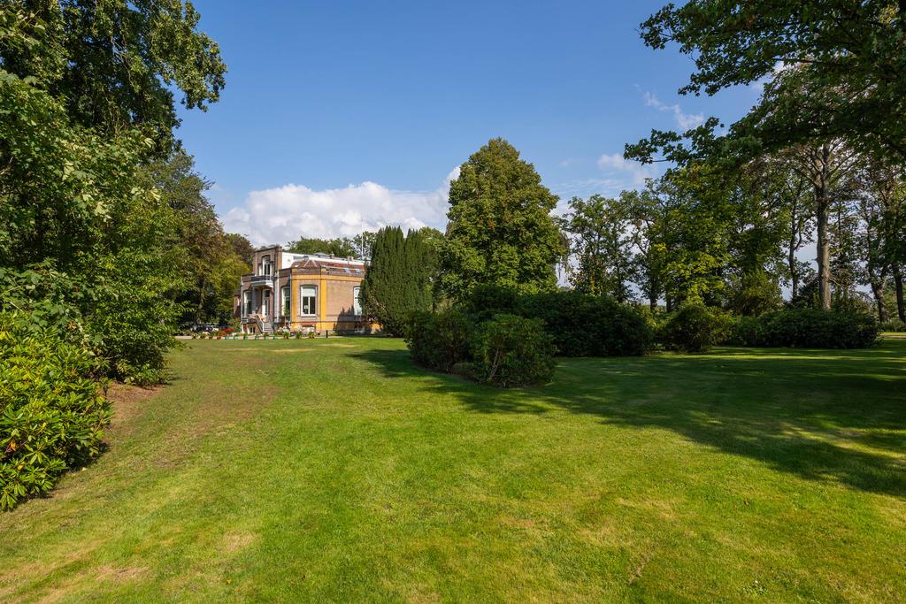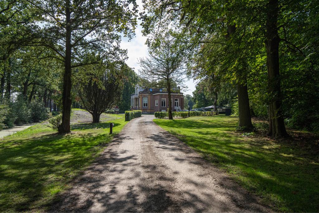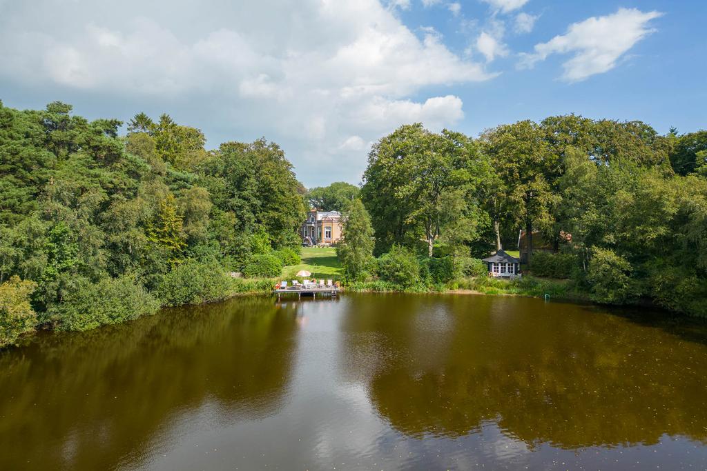 Aan de achterzijde een bordestrap die leidt naar het grote terras in de tuin; een heerlijke plek om te ontbijten in de zon. Het perceel is ruim 5 ha. groot. Aan de achterzijde grenst de tuin aan het imposante Vegelinbos, dat hoort bij het landgoed, inclusief de grote vijver die uitnodigt tot zwemmen, picknicks aan de waterkant op het plankier, of een aanzoek bij zonsondergang. Al die dingen bij elkaar kan natuurlijk ook. Er is een theekoepeltje in chaletstijl uit 1900, een prieeltje aan het water en voor het koetshuis liggen plannen klaar zodat deze getransformeerd kan worden tot nieuwe B&B-suites of woonruimte met separate oprit.