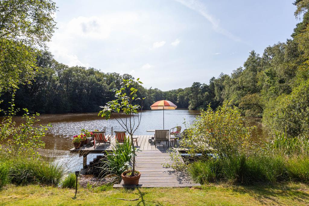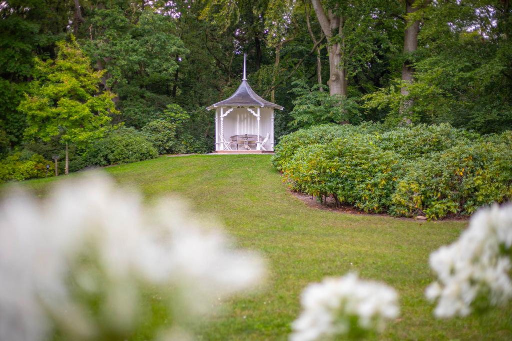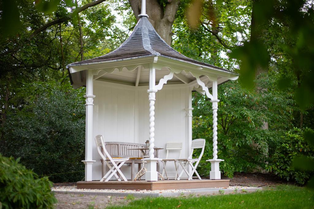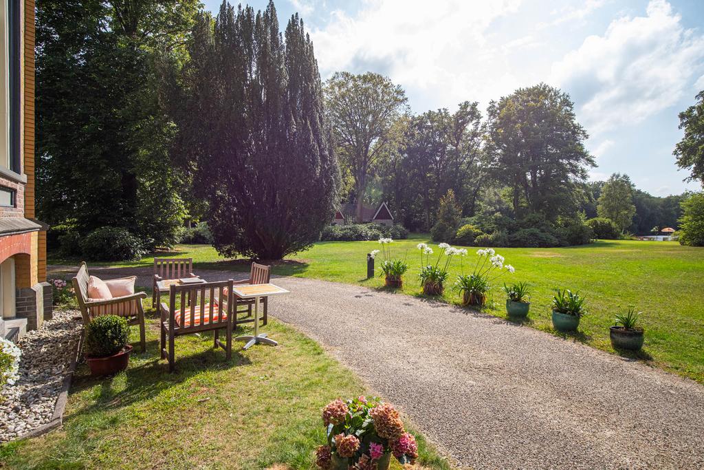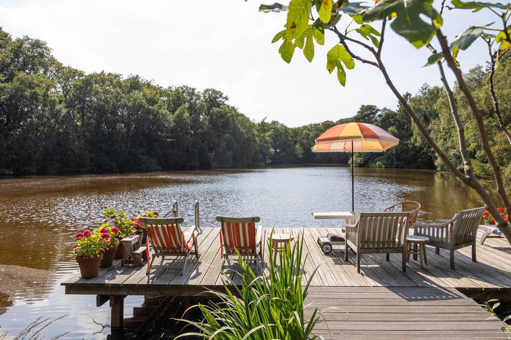 Aan de achterzijde een bordestrap die leidt naar het grote terras in de tuin; een heerlijke plek om te ontbijten in de zon. Het perceel is ruim 5 ha. groot. Aan de achterzijde grenst de tuin aan het imposante Vegelinbos, dat hoort bij het landgoed, inclusief de grote vijver die uitnodigt tot zwemmen, picknicks aan de waterkant op het plankier, of een aanzoek bij zonsondergang. Al die dingen bij elkaar kan natuurlijk ook. Er is een theekoepeltje in chaletstijl uit 1900, een prieeltje aan het water en voor het koetshuis liggen plannen klaar zodat deze getransformeerd kan worden tot nieuwe B&B-suites of woonruimte met separate oprit.