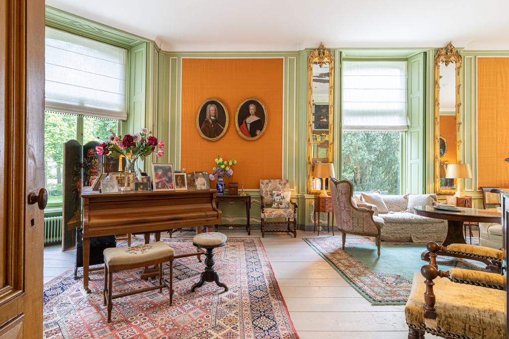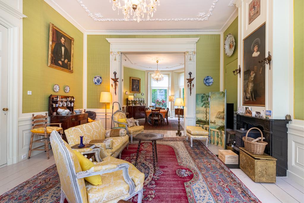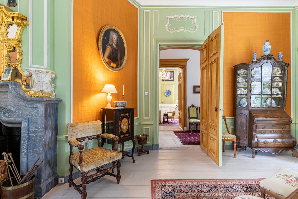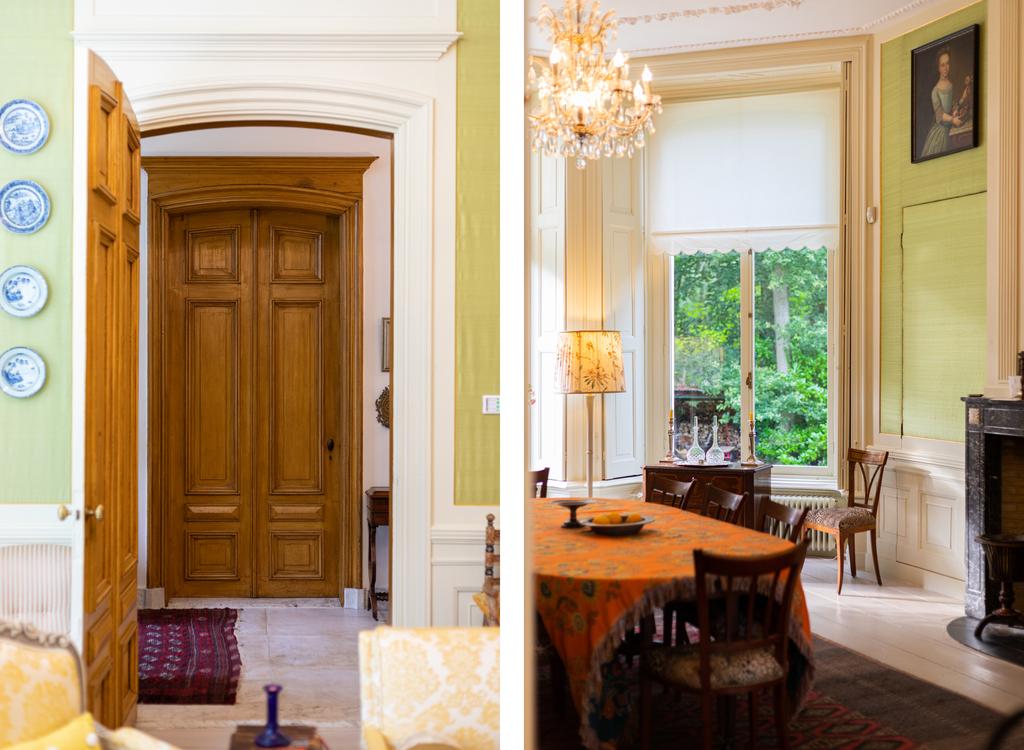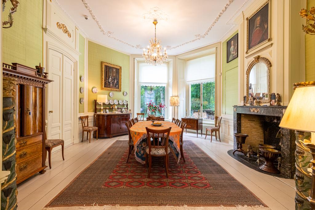 Aan de rechterzijde de salon en-suite en de fabelachtig mooie eetkamer. De wandbespanning in een fonkelend lindegroen is hier ook weer een prachtige blikvanger en een fraai décor voor de collectie erfstukken. Het kan prima zijn dat zelfs de verjaardag van de hond aanleiding genoeg vormt voor een uitgebreid diner met vrienden en familie, want deze ruimte vraagt om gezelligheid en samenzijn. In de hoek bevindt zich een ingebouwd kabinetje voor het pronkservies. Beide ruimtes hebben fraaie haardpartijen; de haard in de eetzaal stamt uit 1871, en wordt bekroond door een haardstuk aangebracht in 1931. Dit is het kinderportret van jonkheer Mr W.J.M., de grootvader van de huidige eigenaar.