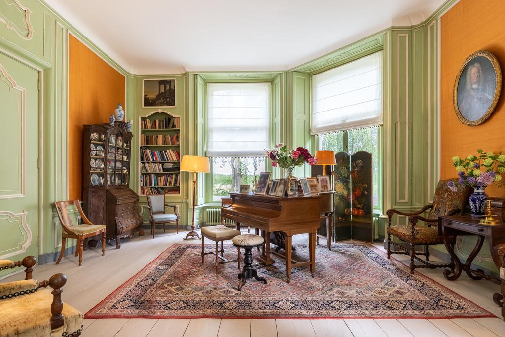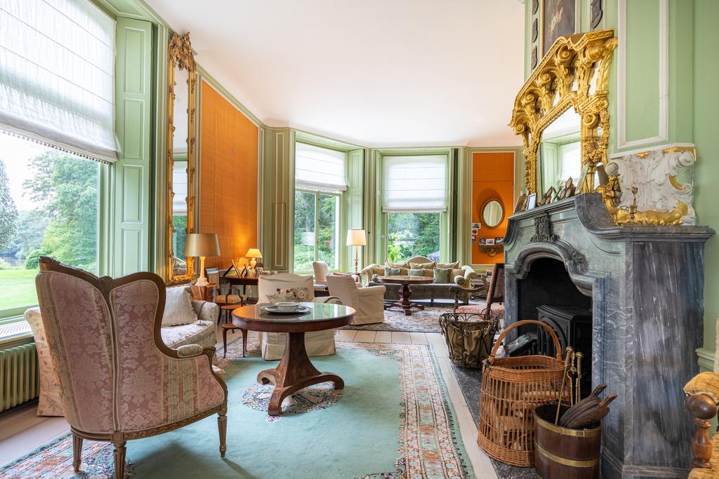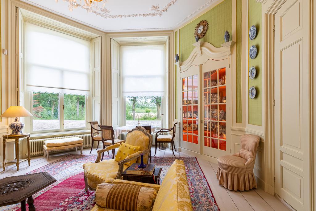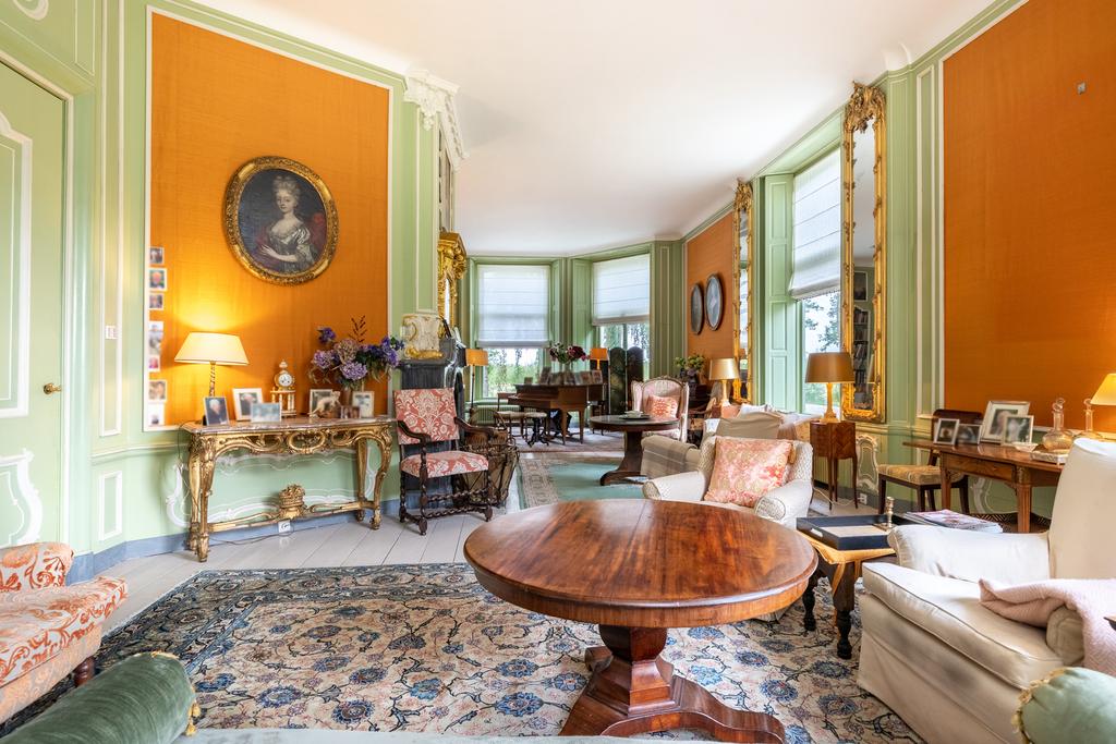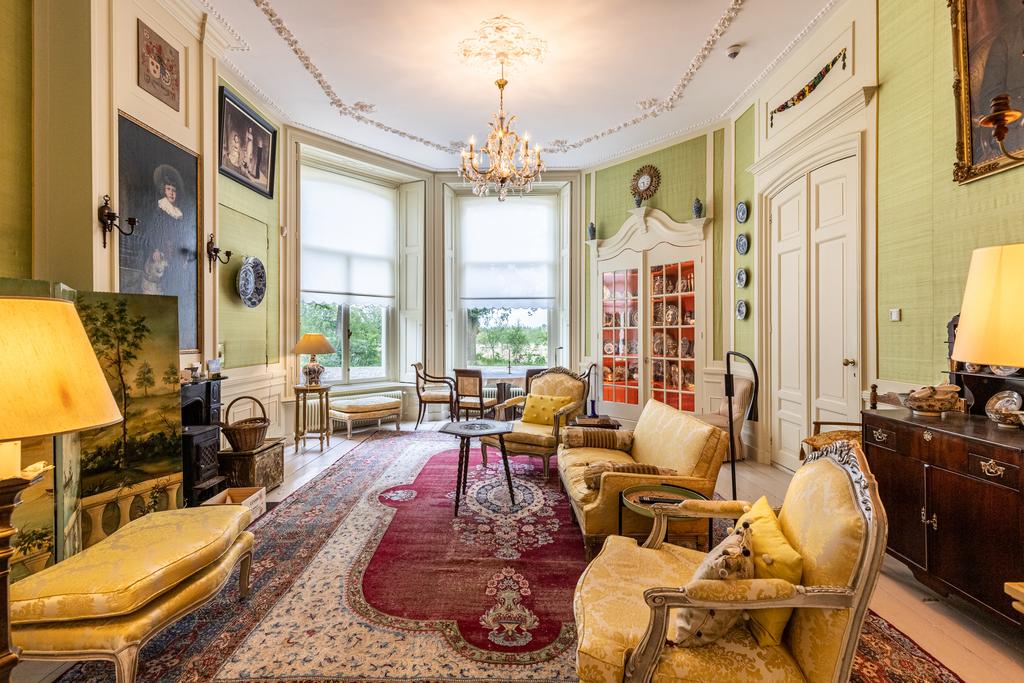 Aan de rechterzijde de salon en-suite en de fabelachtig mooie eetkamer. De wandbespanning in een fonkelend lindegroen is hier ook weer een prachtige blikvanger en een fraai décor voor de collectie erfstukken. Het kan prima zijn dat zelfs de verjaardag van de hond aanleiding genoeg vormt voor een uitgebreid diner met vrienden en familie, want deze ruimte vraagt om gezelligheid en samenzijn. In de hoek bevindt zich een ingebouwd kabinetje voor het pronkservies. Beide ruimtes hebben fraaie haardpartijen; de haard in de eetzaal stamt uit 1871, en wordt bekroond door een haardstuk aangebracht in 1931. Dit is het kinderportret van jonkheer Mr W.J.M., de grootvader van de huidige eigenaar.