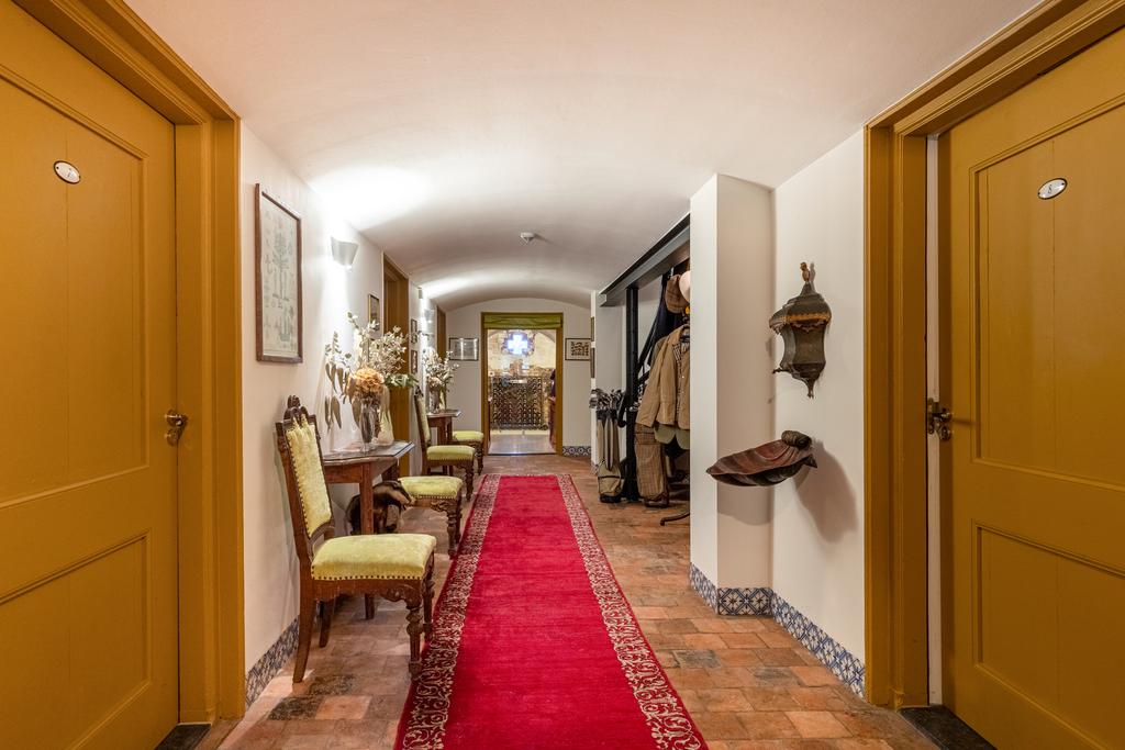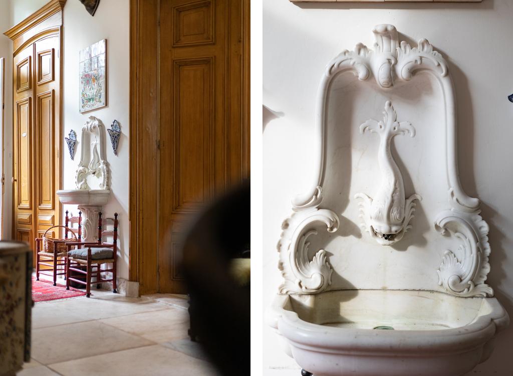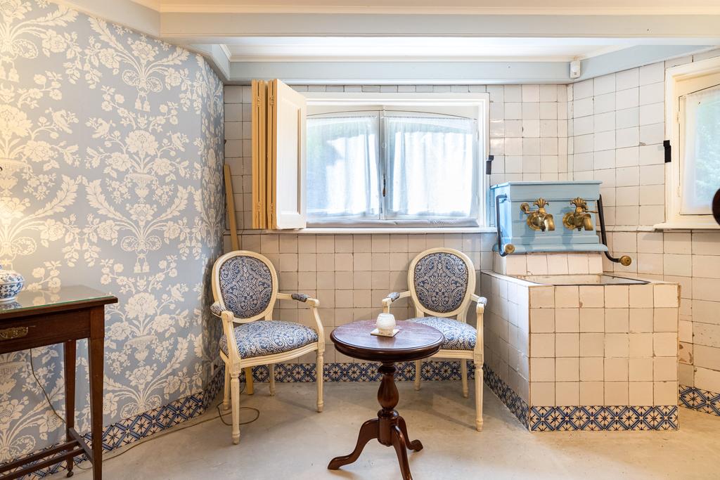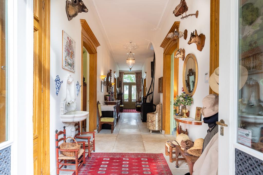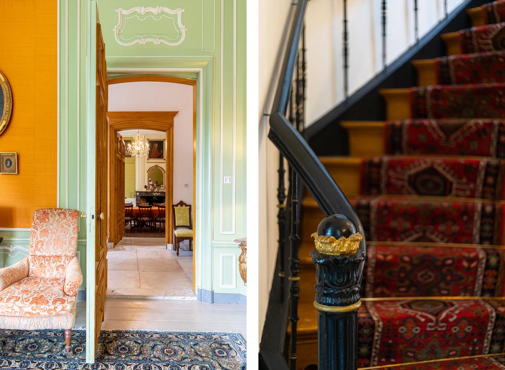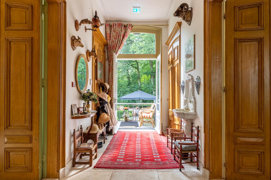 Het huis is in de afgelopen jaren liefdevol gerestaureerd en gemoderniseerd. Oud en nieuw gaan moeiteloos samen, en veel van de verduurzaming zit onder de motorkap; de ambiance is authentiek en neemt ons mee naar de glorieuze 19e eeuw, waar het romantiek troef was. Dit buitenhuis is doorspekt met fraaie details; gouden acanthusbladeren rond de trapleuning, een marmeren bassin waar een dolfijn waterspuwt, de fraaie haardpartijen, kleurrijke damasten wandbespanning en de krullerige sierlijsten - om maar een tipje van de sluier op te lichten.