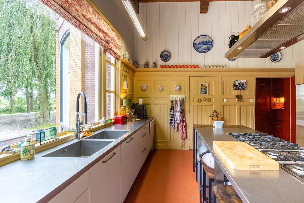 Twee deuren vanuit de salon en eetkamer, leiden naar de voormalige biljartkamer, thans de keuken: deze is geheel Gastronorm ingericht, met RVS werkbladen, een kookeiland met 10 gastpitten, horeca-afzuigkap en twee grote ijskasten. De onderbouwkasten hebben frisse matwitte fronten en bieden meer dan genoeg bergruimte. Twee grote spoelbakken met een flexibele kraan (Quooker). Het prachtige houtwerk in Bentheimer Geel en de Toile-de-Jouy valletjes geven de afkomst van deze keuken aan, dat daar geen misverstanden over bestaan; er kan hier weliswaar hard worden gewerkt, maar altijd in stijl en van grote klasse. In de hal, aan de achterzijde rechts, de WC, en in het midden het trappenhuis.