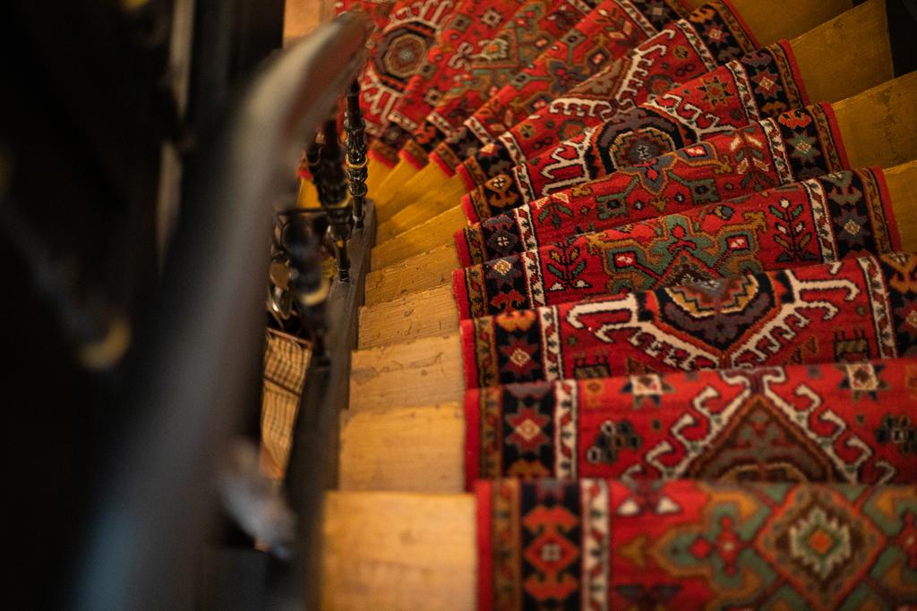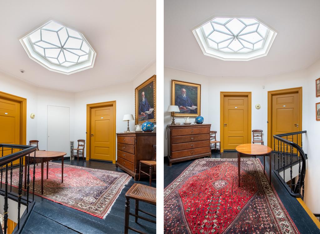 De fraaie trappartij met een Perzische traploper, leidt naar de overloop. Deze wordt bijgelicht door het charmante daklicht met rozetvorm. Hier zijn de vier deuren naar de grote suites: