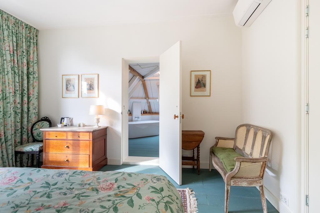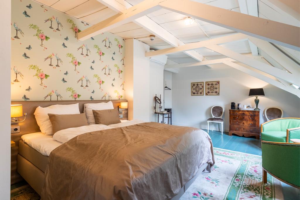 - De Meidenkamer – naast de wijnkelder en met vrij uitzicht over de tuin en het koetshuis;